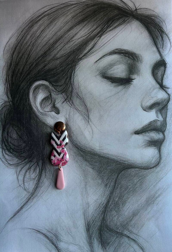 Statement katten oorbellen met zwart wit streepjespatroon en roze kersenbloesems, afgewerkt met resin. Bolle rosé oorsteker uit nikkelvrij en hypoalergeen materiaal. Chuloo is 8 cm lang. ( Large)