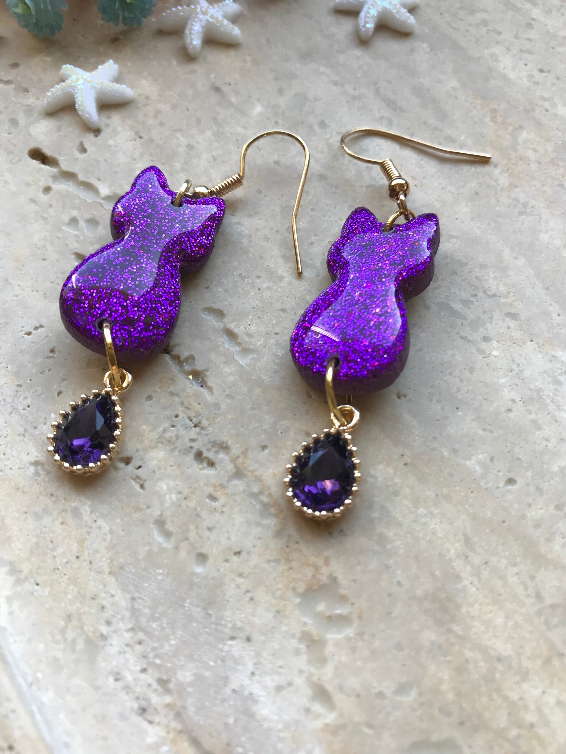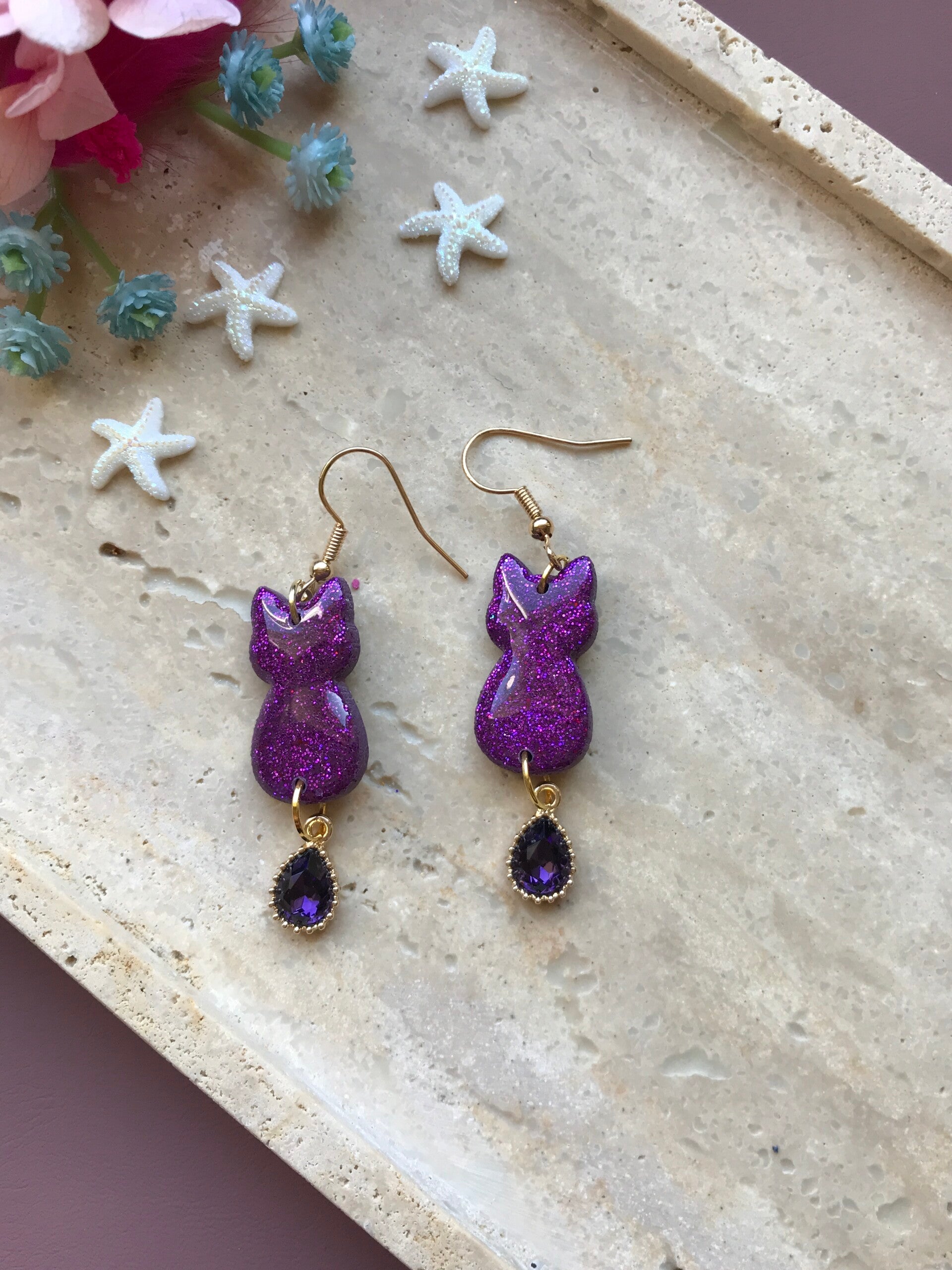 Leuke katten oorbellen met paarse glitters, afgewerkt met resin en paars kristallen staartje. Oorsteker uit rvs, nikkelvrij.