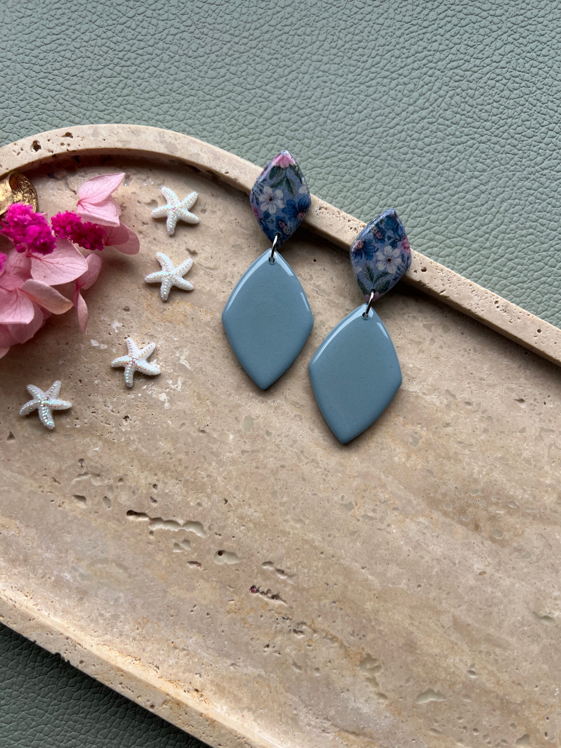 Een romantische zacht groene bloemenprint, afgewerkt met zilver. COLETTA is 7 cm lang