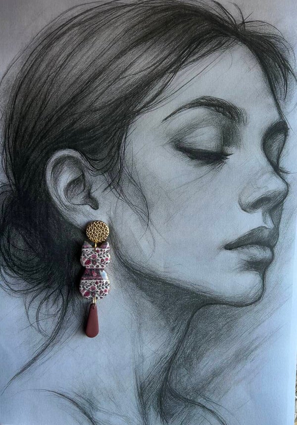 De Rustic Petals oorbellen combineren een zacht patroon in lila en bordeaux met een elegante gouden oorsteker.