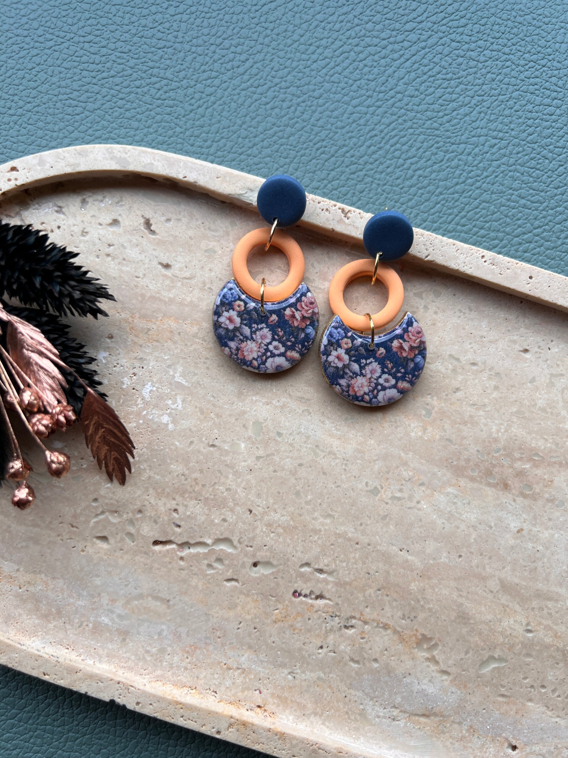 Laat je betoveren door de Midnight Blossom collectie – een elegante reeks handgemaakte klei oorbellen waarin donkere, mysterieuze blauwtinten samenkomen met zachte bloemendetails en warme accenten in perzik en navy.