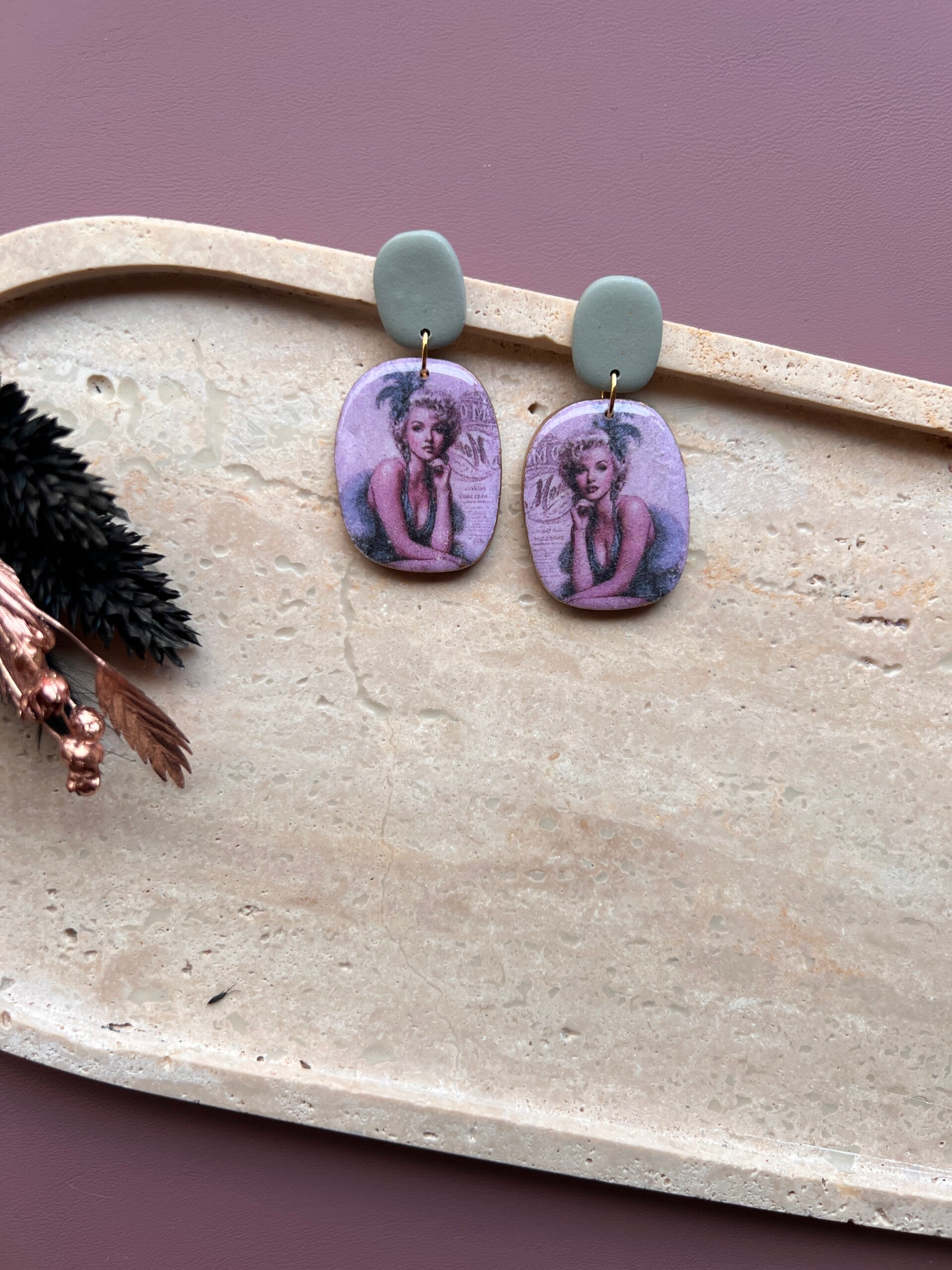 De vintage chique oorbellen van Chulloo zijn een ode aan vintage glamour en vrouwelijke kracht. Deze unieke statement oorbellen combineren een stijlvolle salie groene basis met vintage afbeelding van marilyn monroe.
