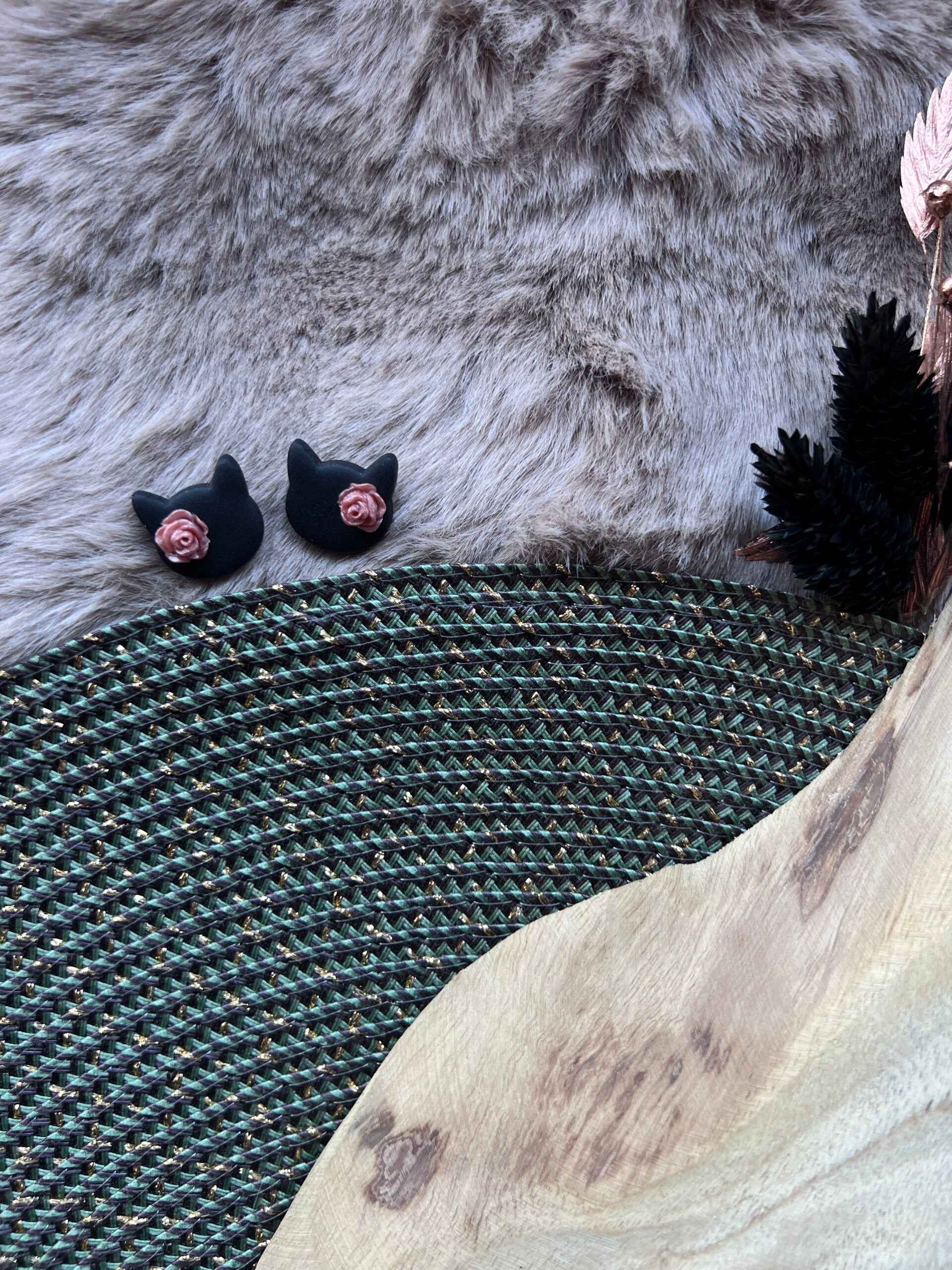 Zwarte katten stud met rosé roosje. 2,5 cm lang.
