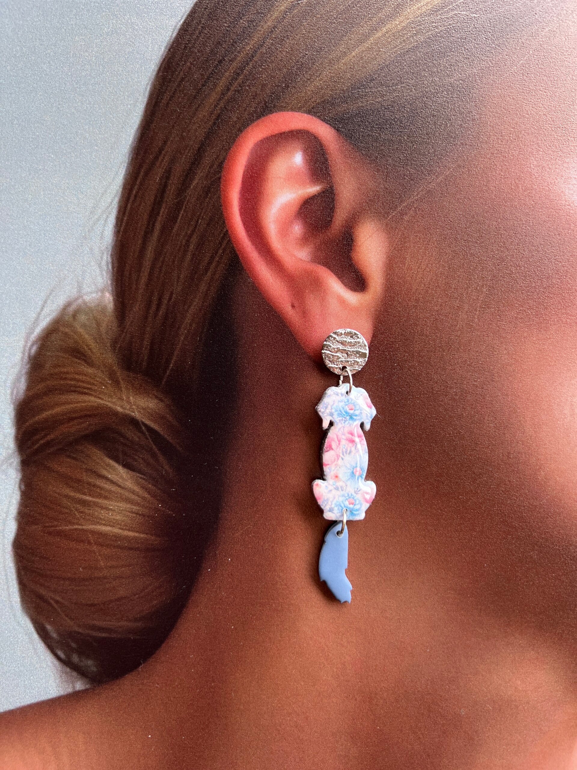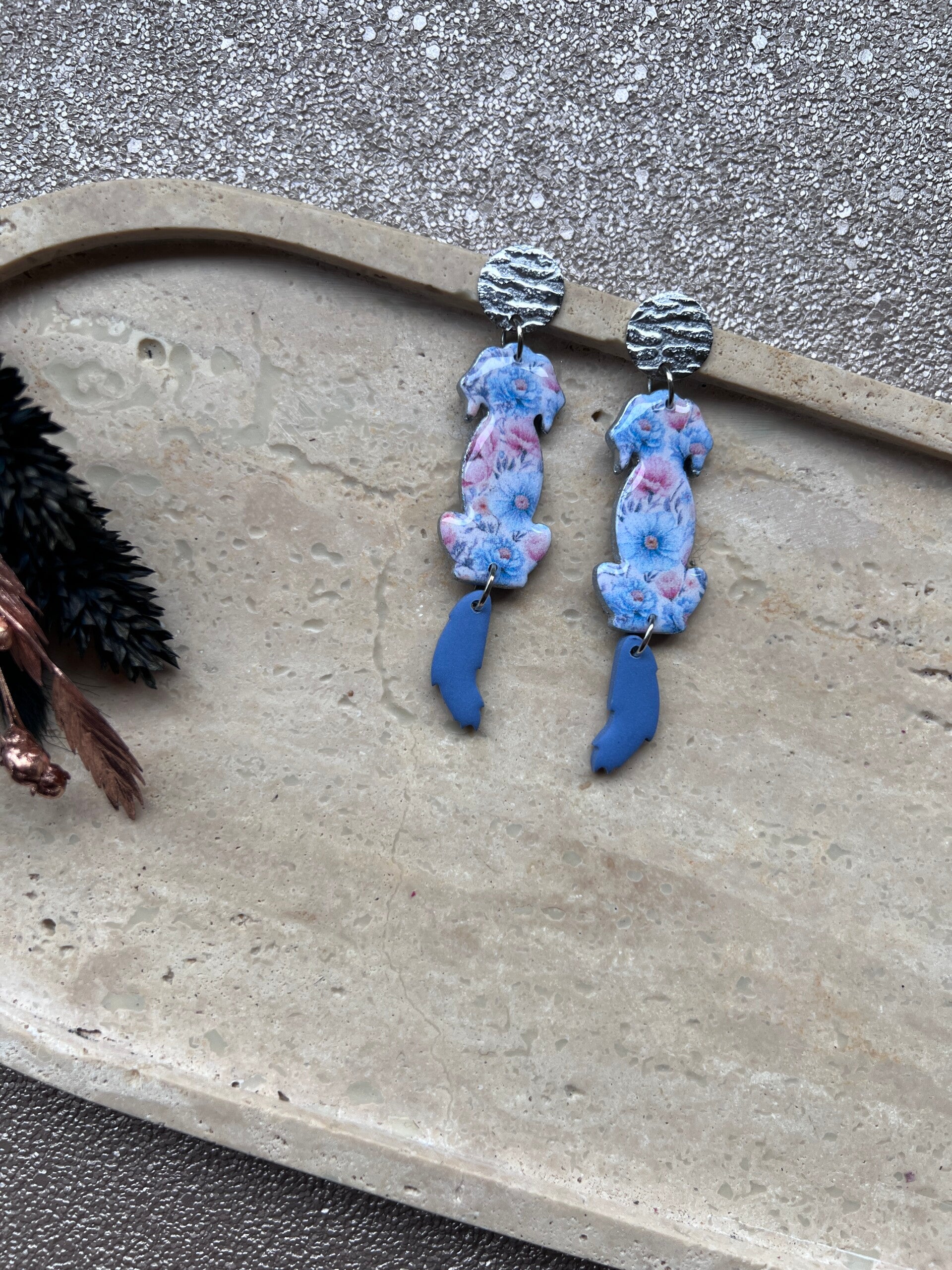 oorstekers van nikkel, cadmium en loodvrij metaal. Afgewerkt met resin en zilveren randje. 7 cm lang