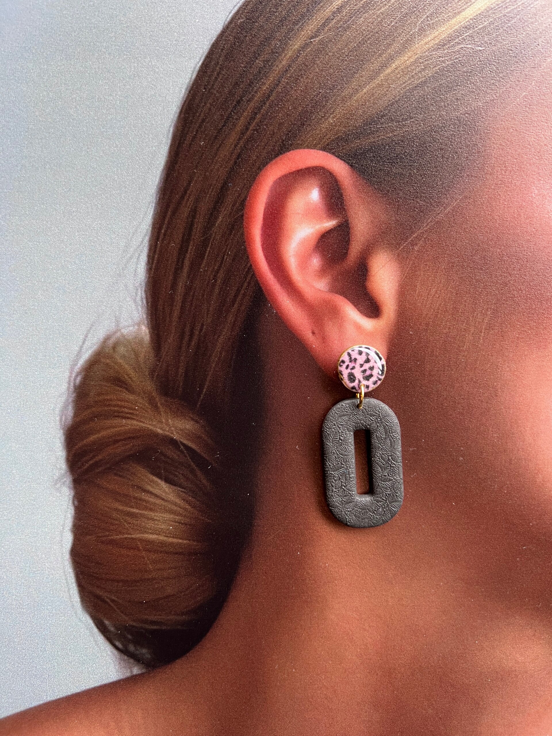 Zwart polymeer vormt een zachte, matte basis waarin een subtiel bladmotief zichtbaar is, terwijl de luipaardprint in de oorsteker een gedurfde twist toevoegt.