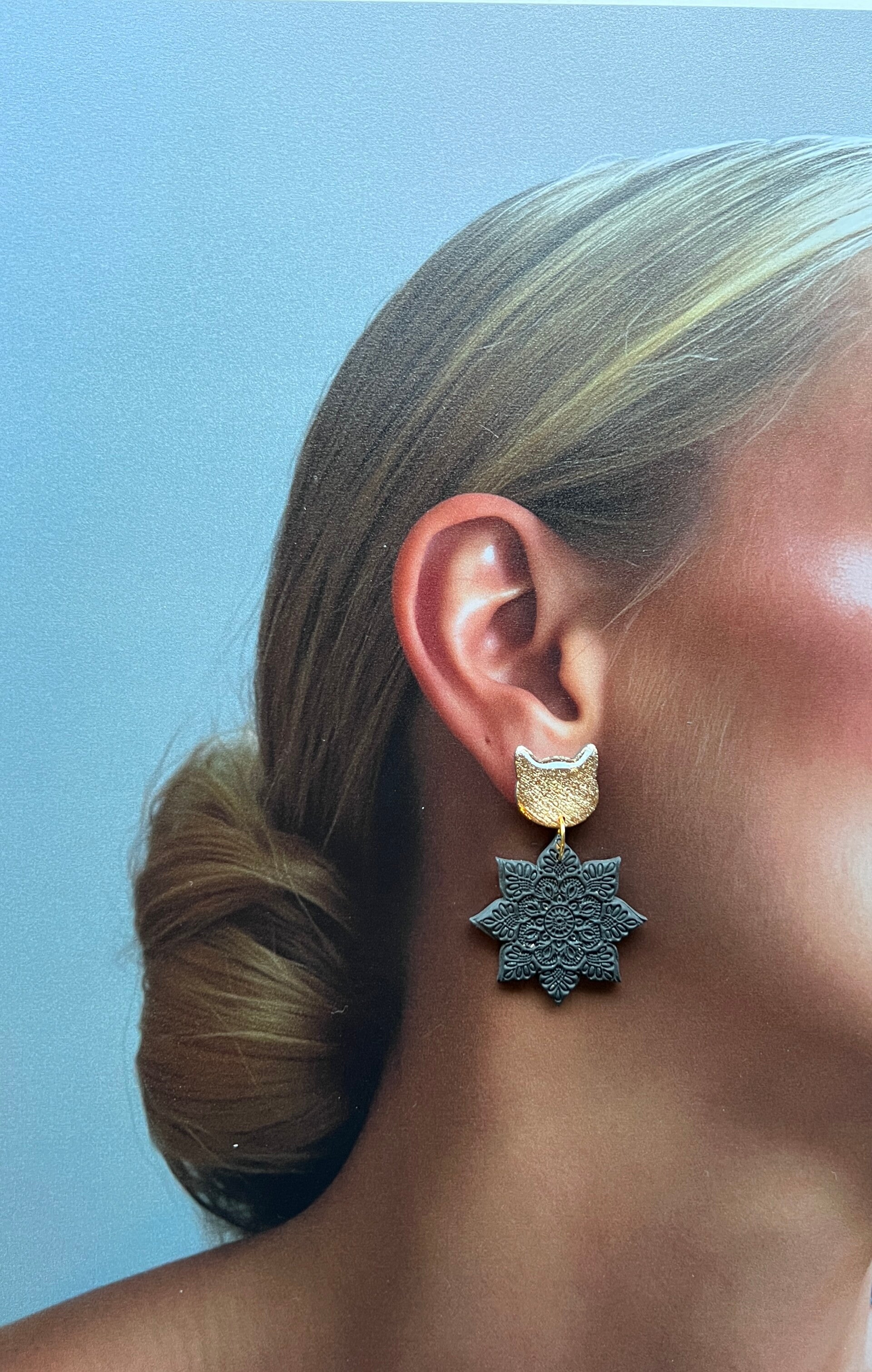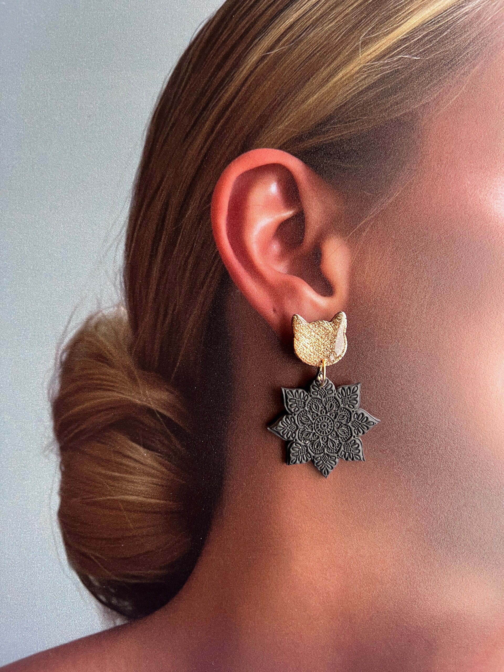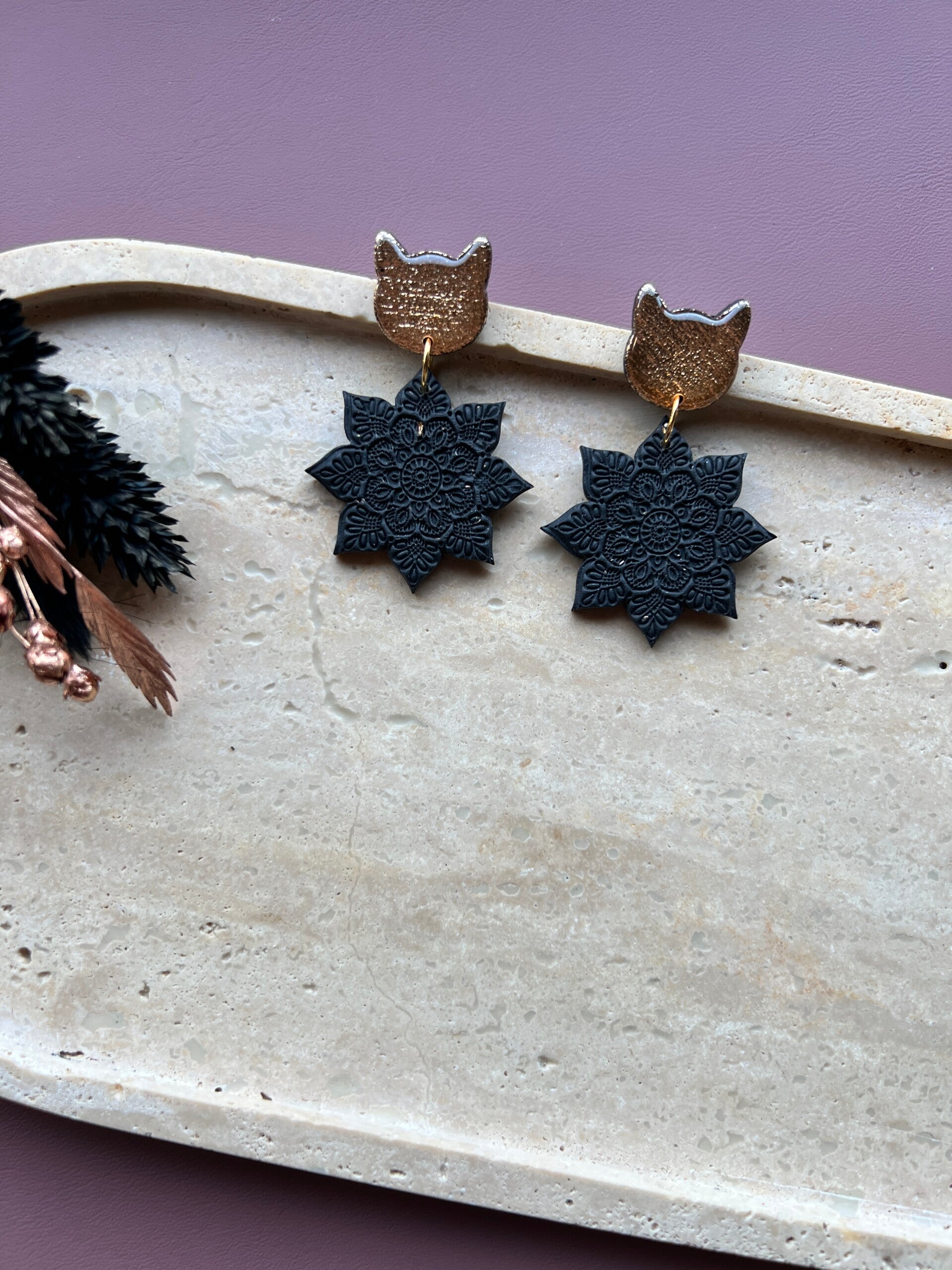 Elk paar combineert een gedurfd kattensilhouet met een zwarte Mandala hanger — handgemaakt uit klei en afgewerkt met resin voor een glimmende, luxueuze finish.