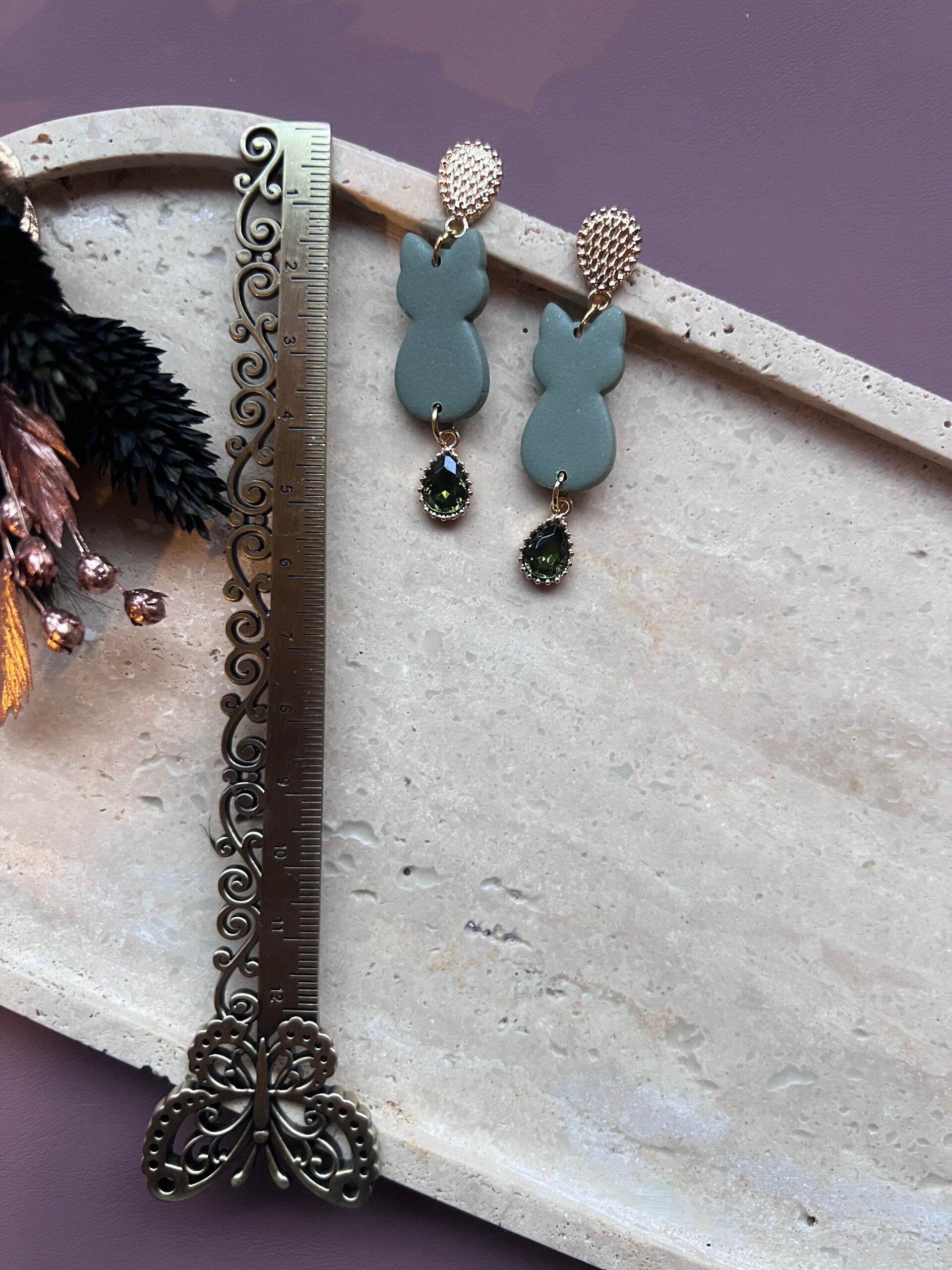 De Emerald Whisker oorbellen combineren mat mosgroene klei met sprankelende smaragdgroene kristallen en gouden accenten.