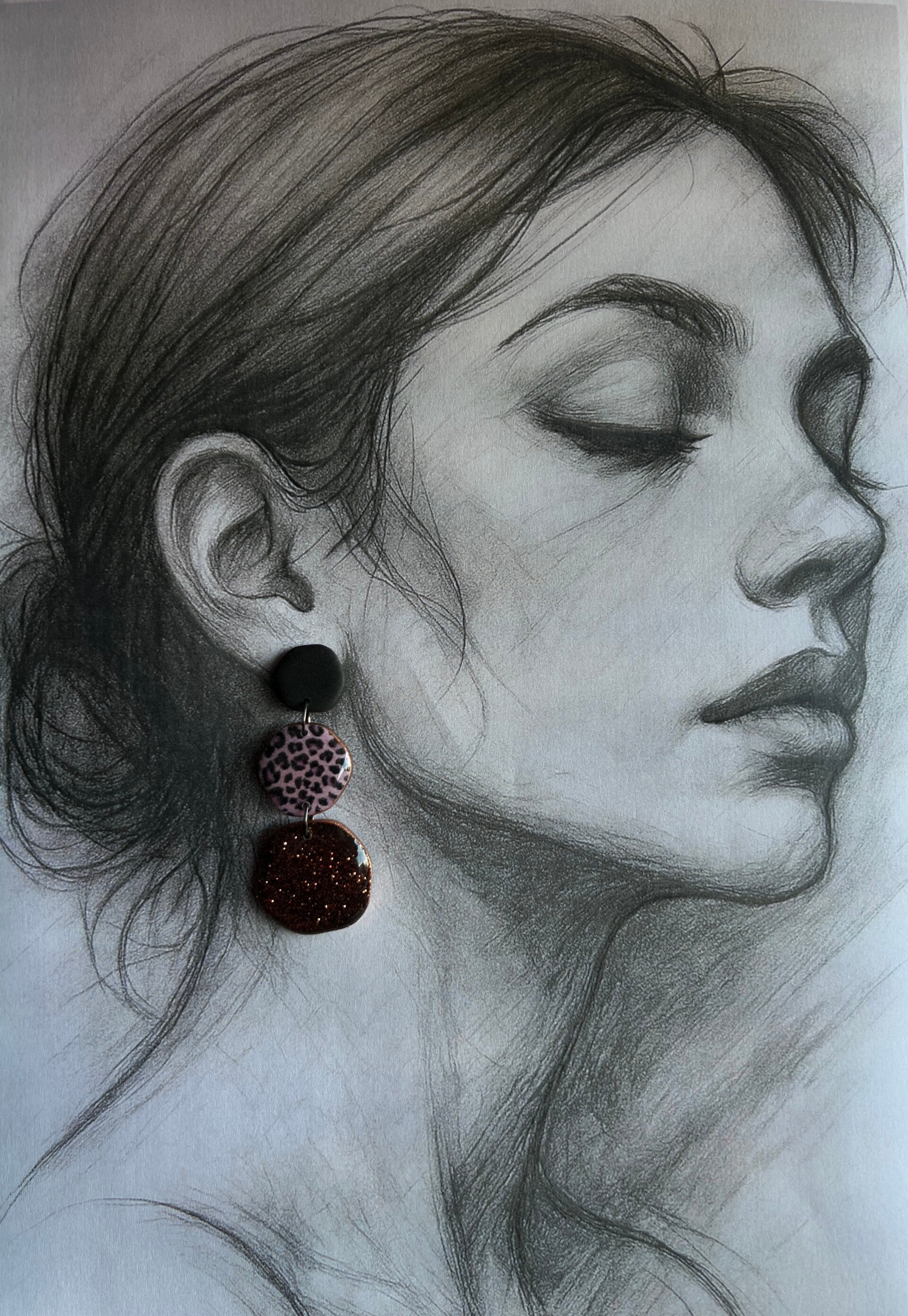 De pebble oorbellen combineren zachte luipaardprint met warme bruine glitter voor een gedurfd maar verfijnd statement.