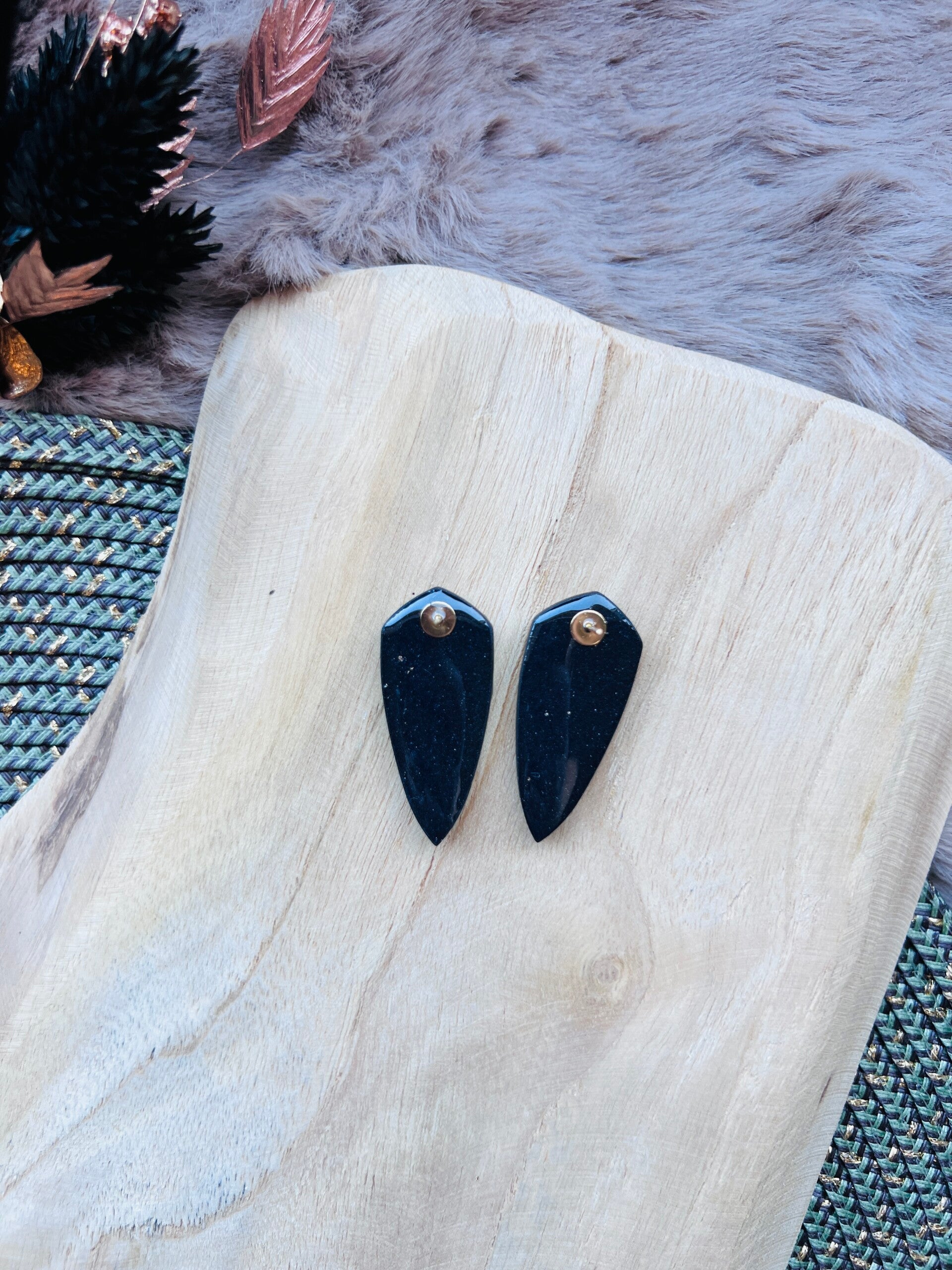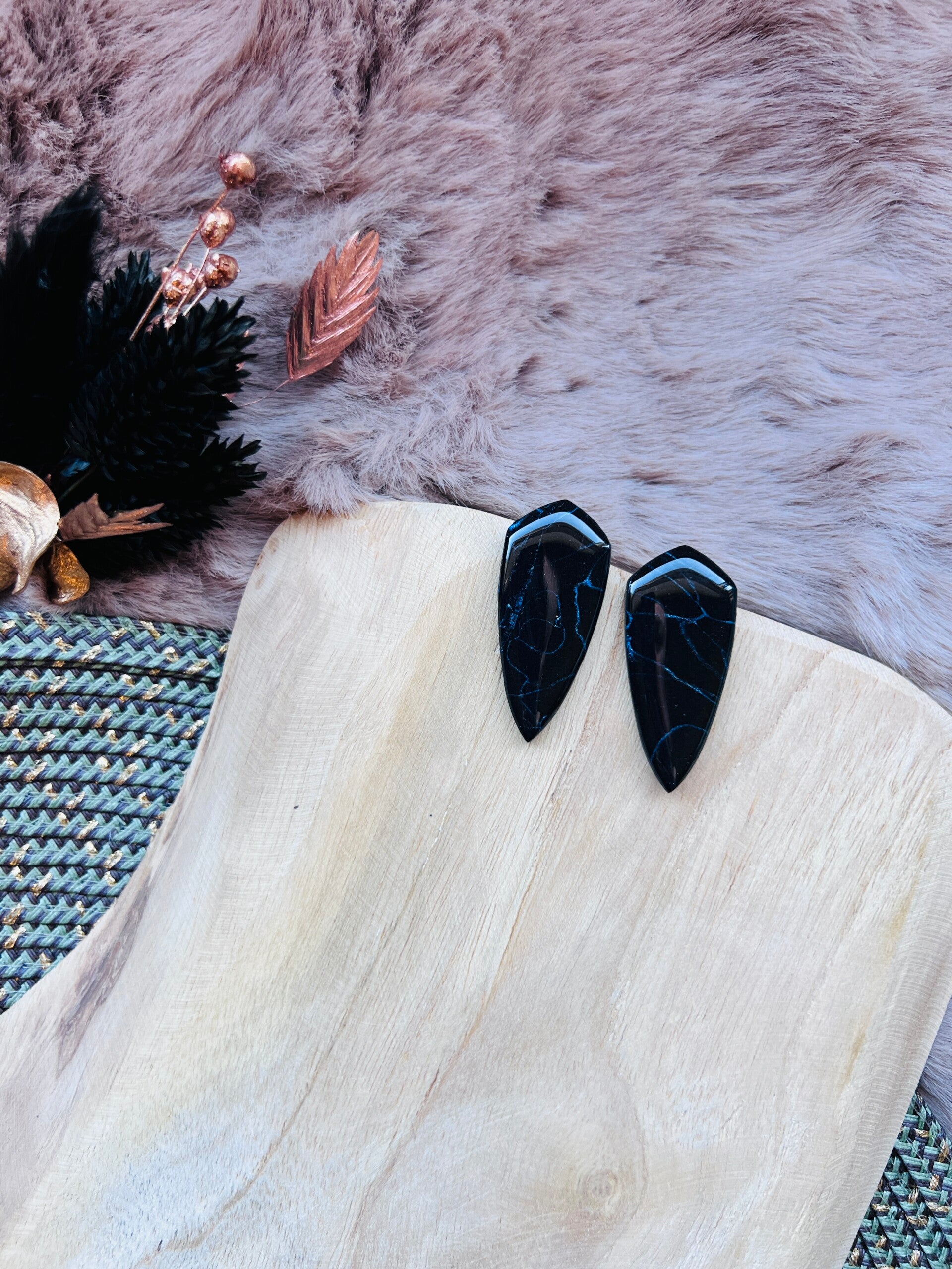 Midnight Volt Stud – zwarte oorstekers met blauw marmer effect uit klei