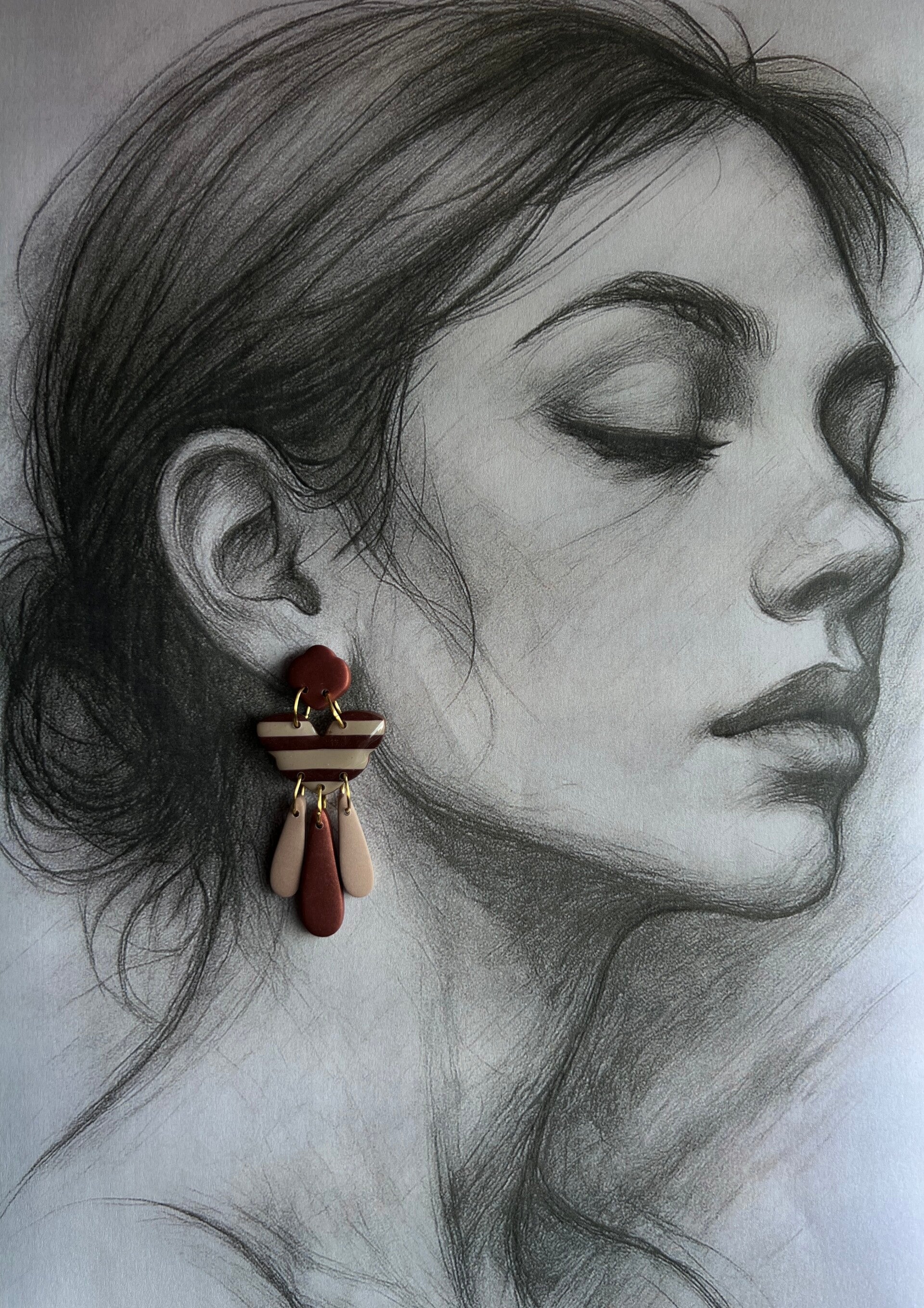 Zachte mokka en brons tinten vloeien samen in een harmonieus lijnenspel, afgewerkt met een subtiele glans die het licht zacht opvangt. De bloemvormige oorsteker voegt een teder detail toe, terwijl de golvende vormen sierlijk meebewegen — een ode aan natuurlijke elegantie, rustig en verfijnd.