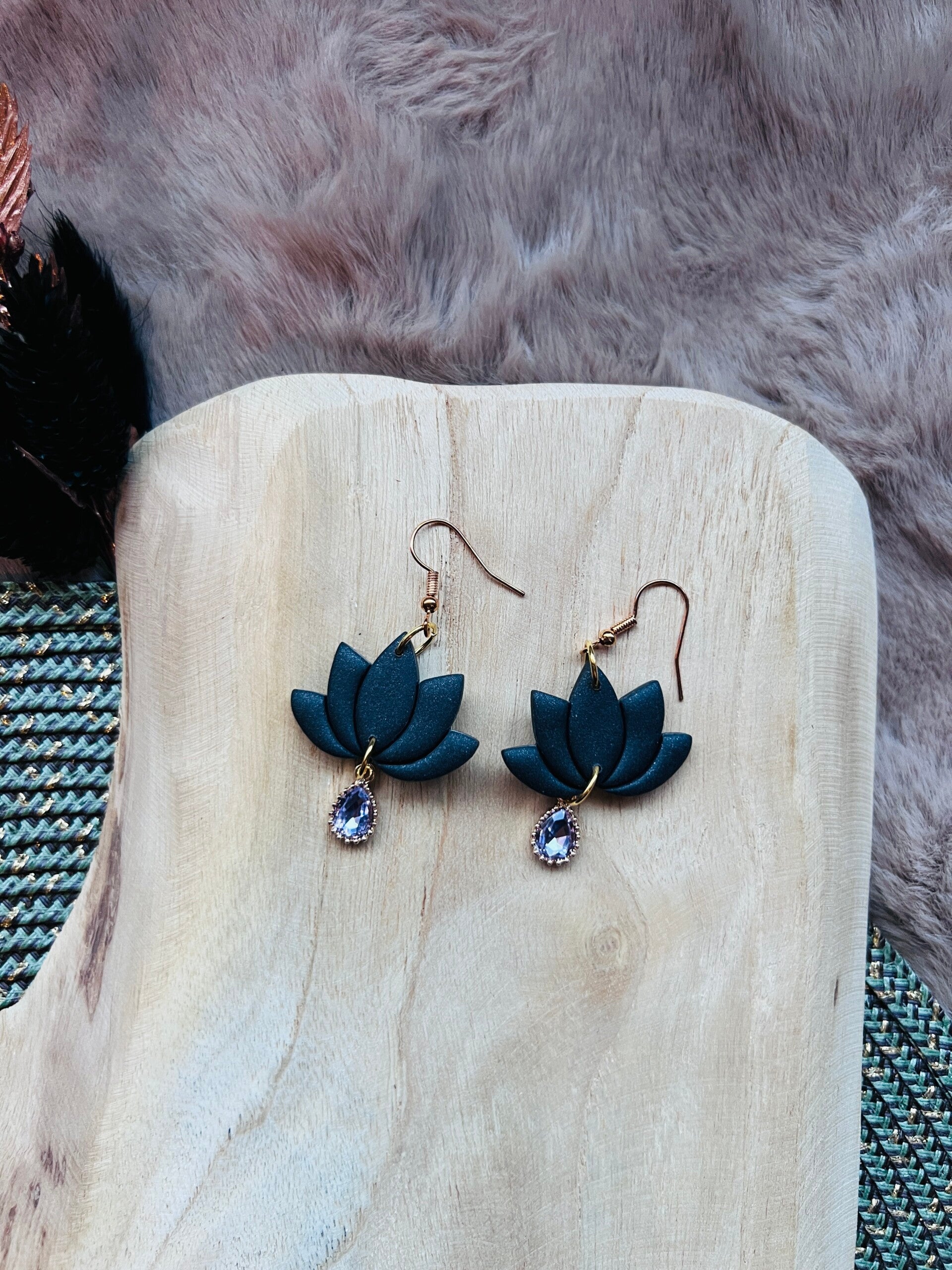 Lotus oorbellen in zwart met lila crystal glasbedel