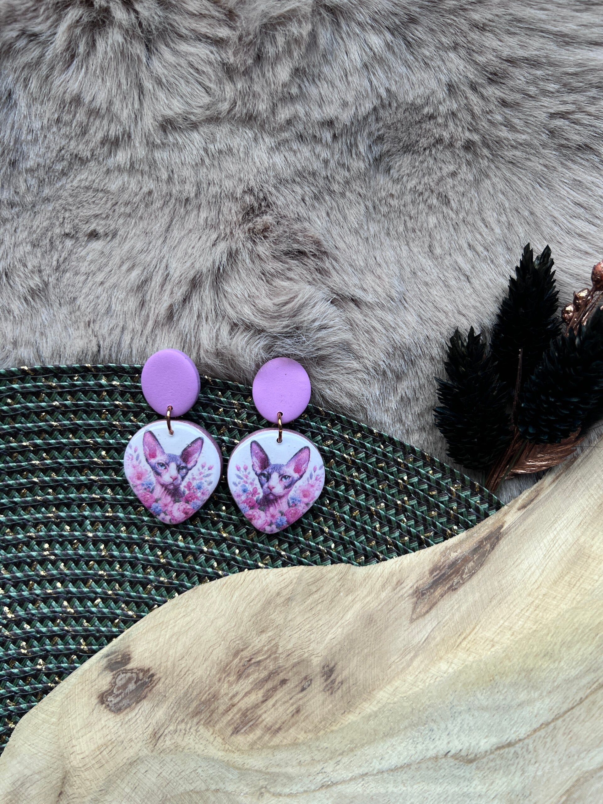 Een charmante sphynx omringd door bloesems, rustend in een zacht lila hart. Handgemaakt met oog voor detail en afgewerkt met verfijnde studs — een vleugje zachtheid met een rebels randje, typisch Chulloo.