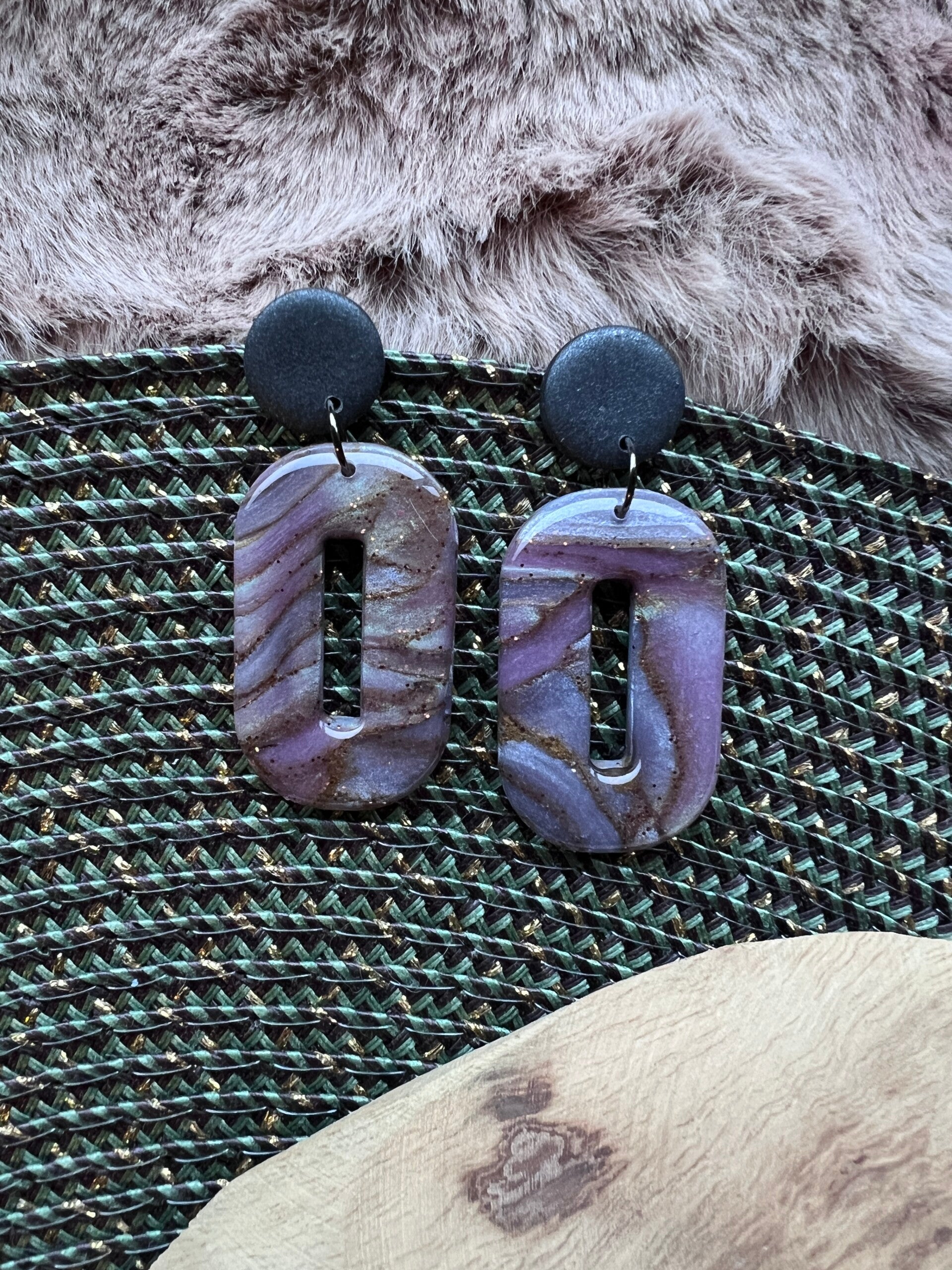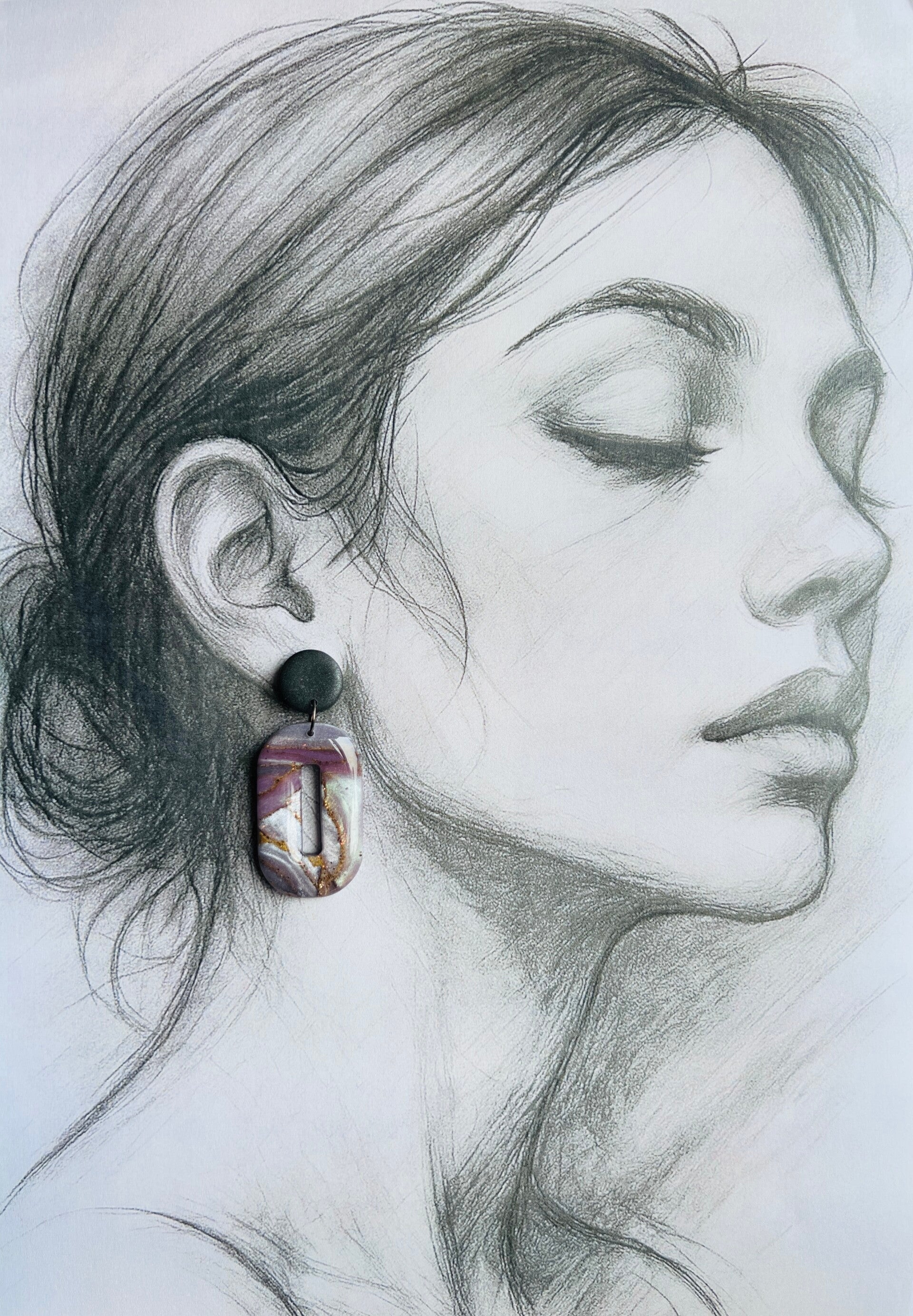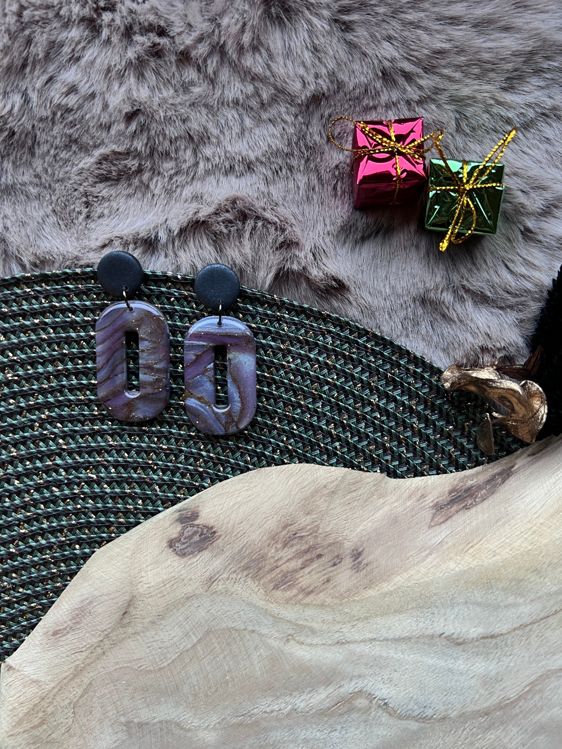 Cleo – Purple Fairy Dust heeft een uitgesproken maar rustige uitstraling: zachte marmerlijnen in lila en taupe die in elkaar overvloeien, gedragen door een matte donkergrijze stud. De rechthoekige vorm met open midden creëert een helder, modern lijnenspel dat lucht geeft aan het geheel. Het resultaat is een elegant statement dat stevig oogt, maar toch licht en verfijnd blijft — een oorbel met karakter, zonder luid te zijn.
