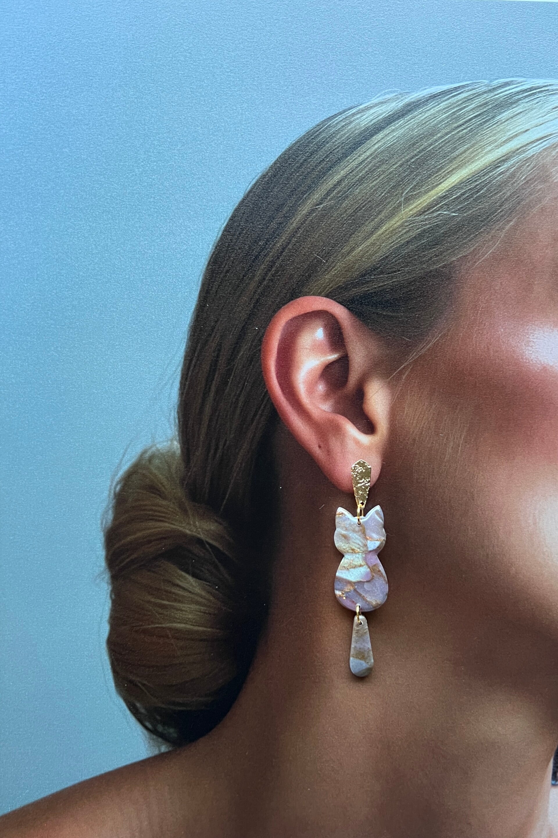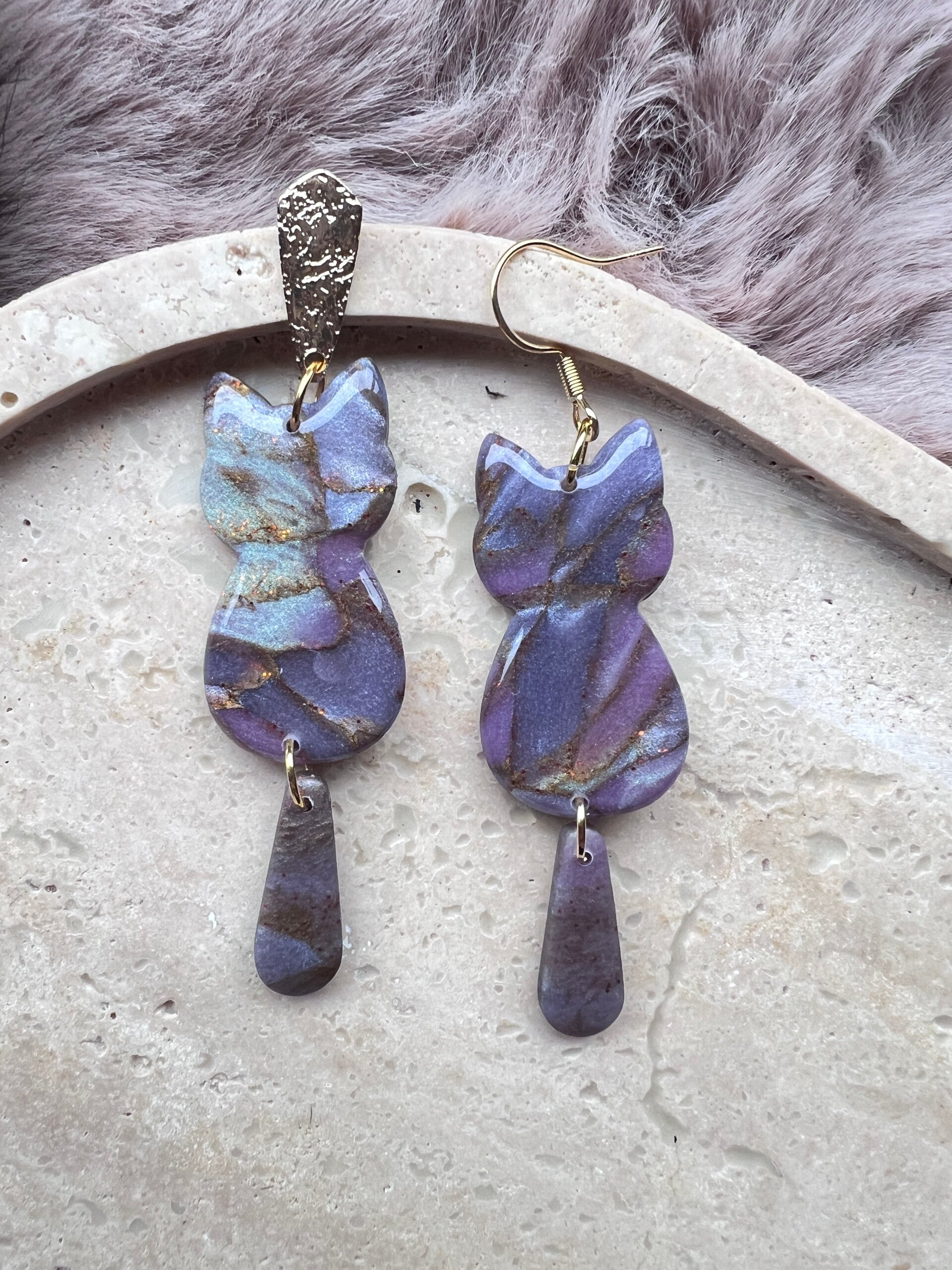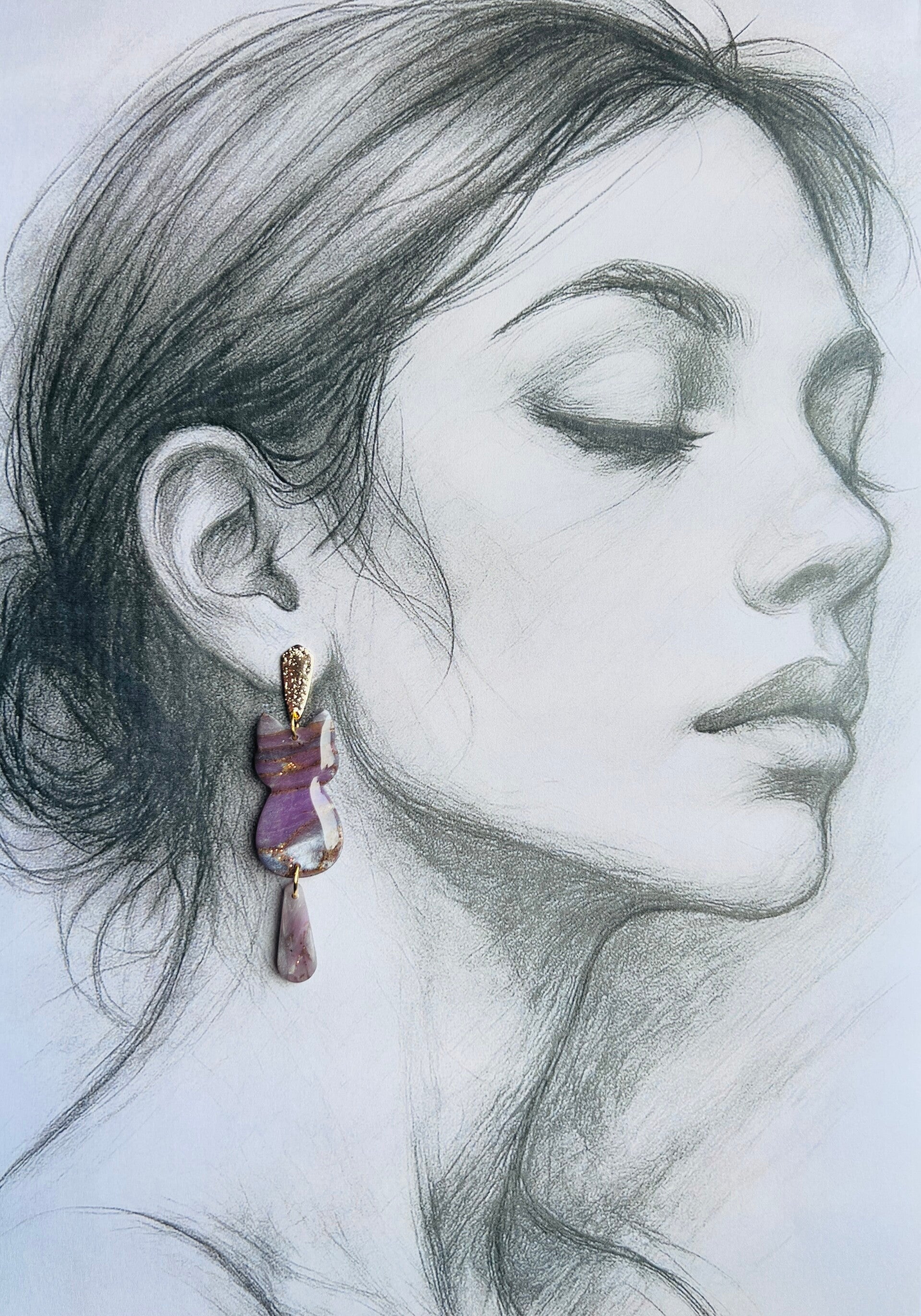 Purple Fairy Dust katten oorbellen heeft een zachte maar uitgesproken elegantie. De gestileerde kattenvorm krijgt diepte door de gemarmerde mix van lila, taupe en subtiel gouden shimmer. De slanke druppelvorm onderaan beweegt licht mee en verlengt de lijn, waardoor het geheel verfijnd en vrouwelijk oogt.