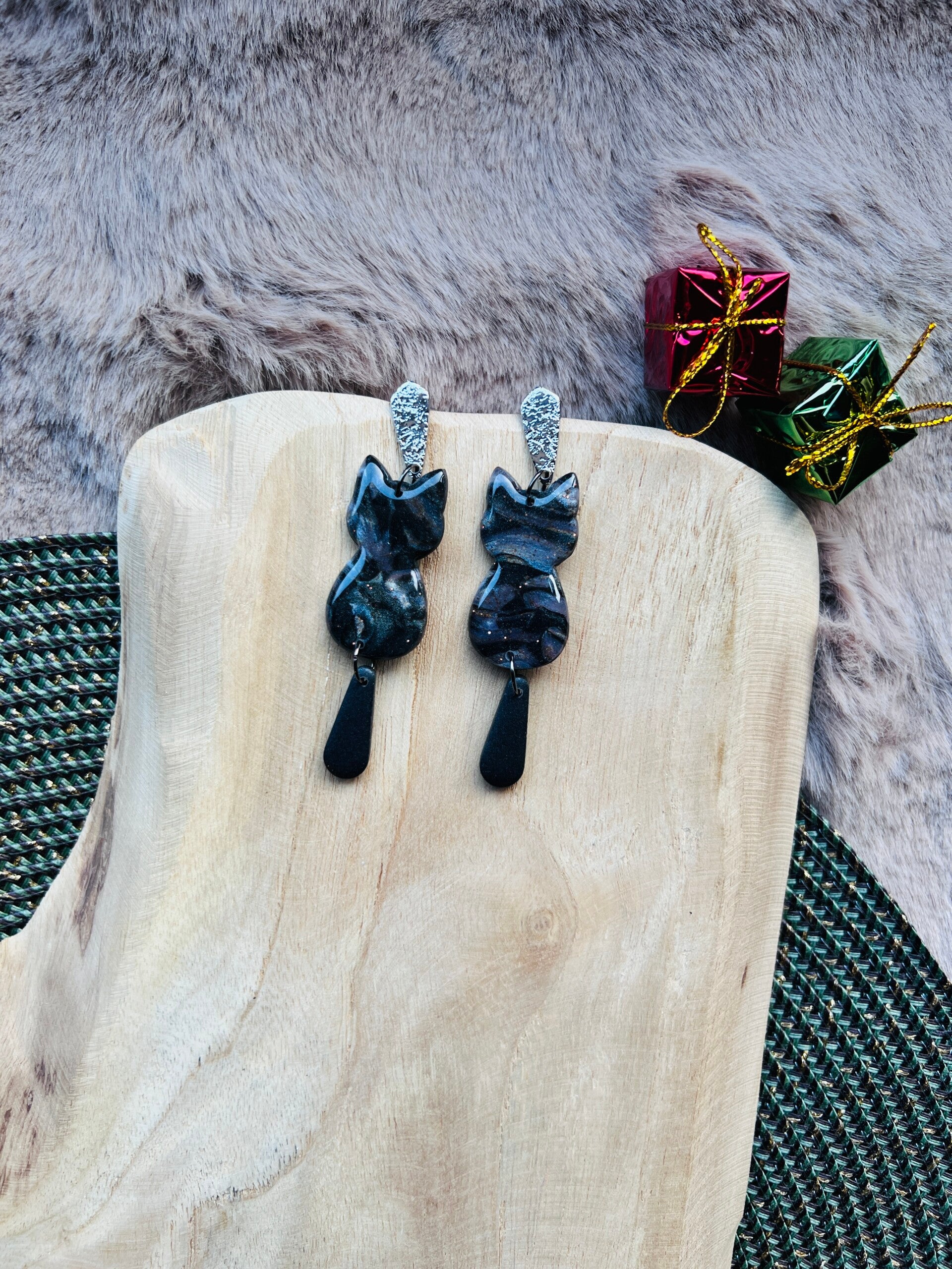 Katten oorbellen Dark Fairy Dust brengt een stille intensiteit met zich mee. De diepdonkere marmerstructuur, doorweven met subtiele glinsteringen, geeft deze kattenoorbellen een mysterieuze, bijna nachtelijke uitstraling. De matte zwarte druppel onderaan verzacht het geheel en maakt het silhouet elegant en slank.