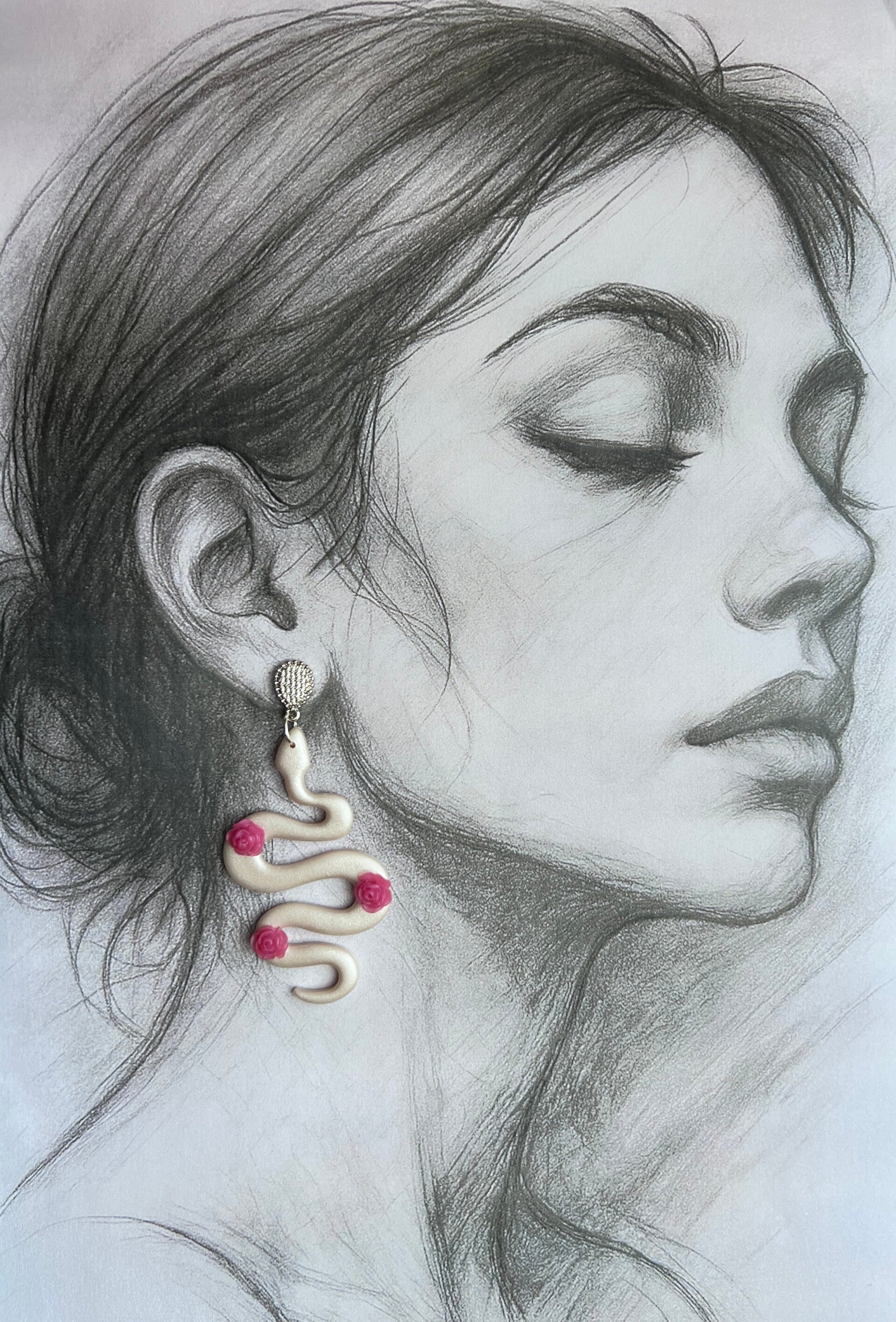 Vixy brengt elegantie met een tikkeltje durf. De sierlijke slangenvorm in parelglans krijgt een opvallende, romantische toets dankzij de roze roosjes. Stoer, vrouwelijk en verrassend verfijnd. Een echte conversation piece.