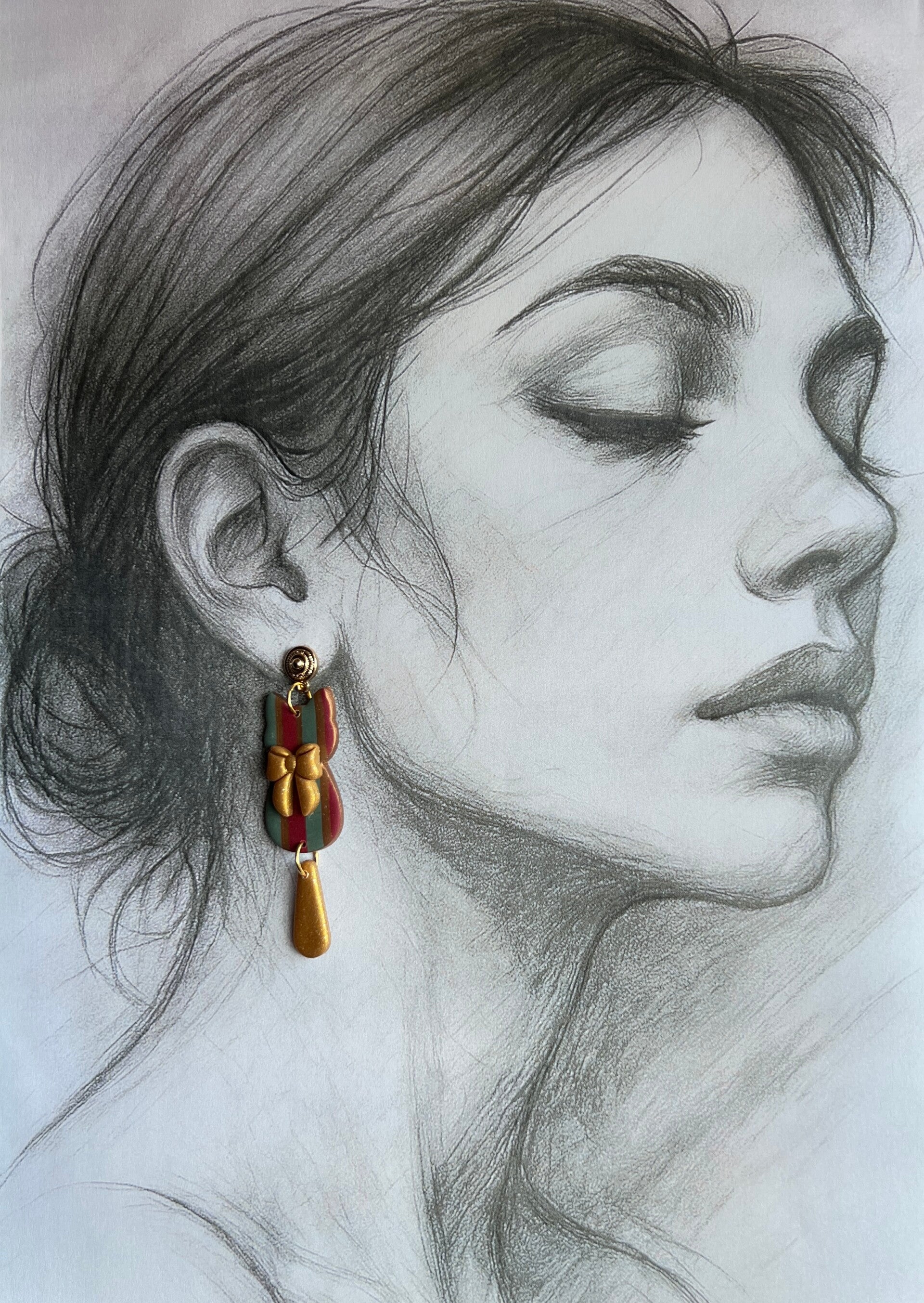 Deze kerstoorbellen combineren warm bordeaux en groen met glanzend goud, afgewerkt met een strikdetail voor een subtiel luxueus accent.