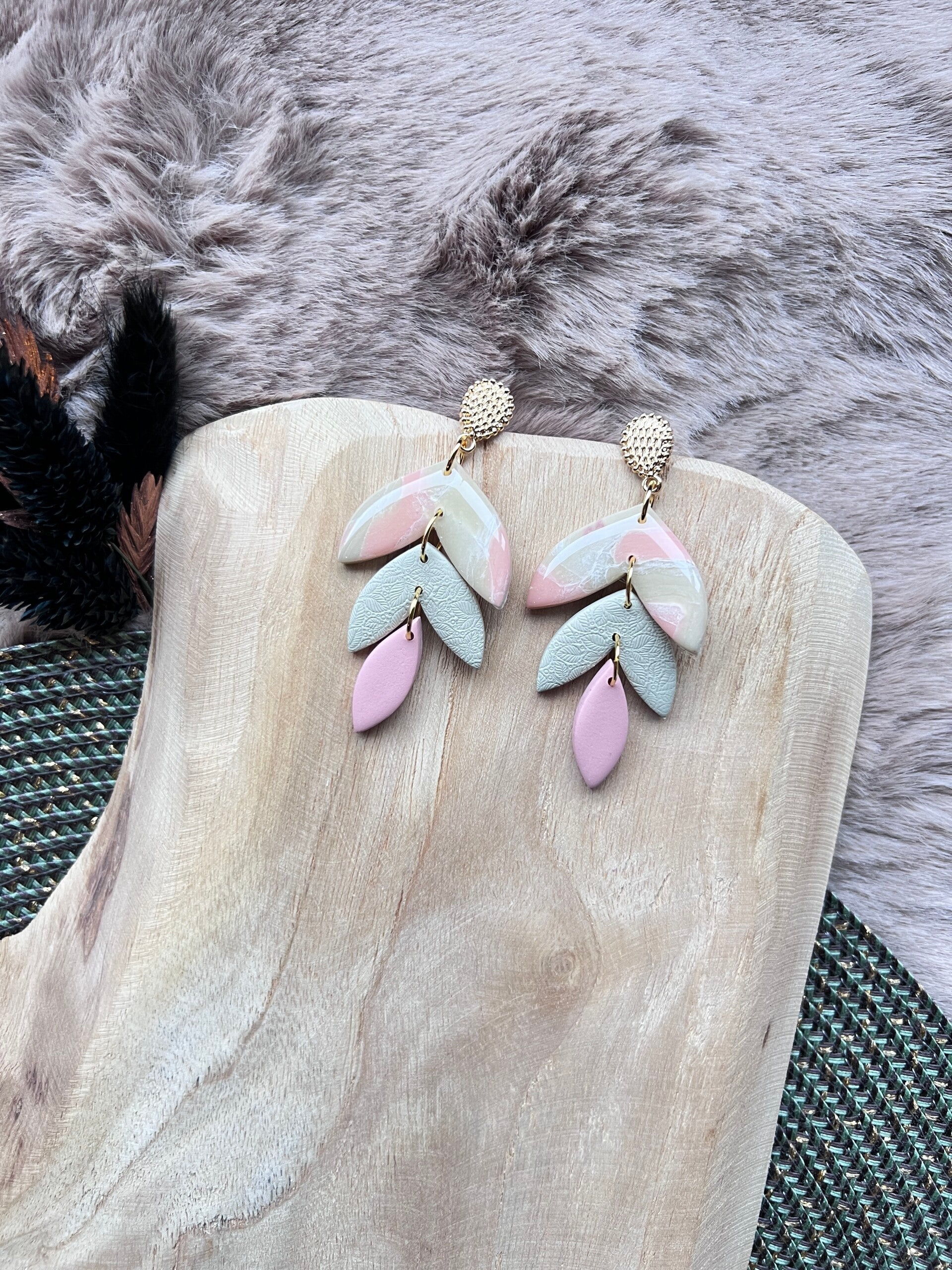 Zachte, gelaagde bladeren in perzik en licht saliegroen vormen een speelse maar elegante oorbel. De subtiele marmertextuur geeft een luxueuze afwerking die perfect past bij winterse knitwear én feestelijke looks. Lichtgewicht, opvallend en helemaal Chulloo: modern, vrouwelijk en tijdloos.