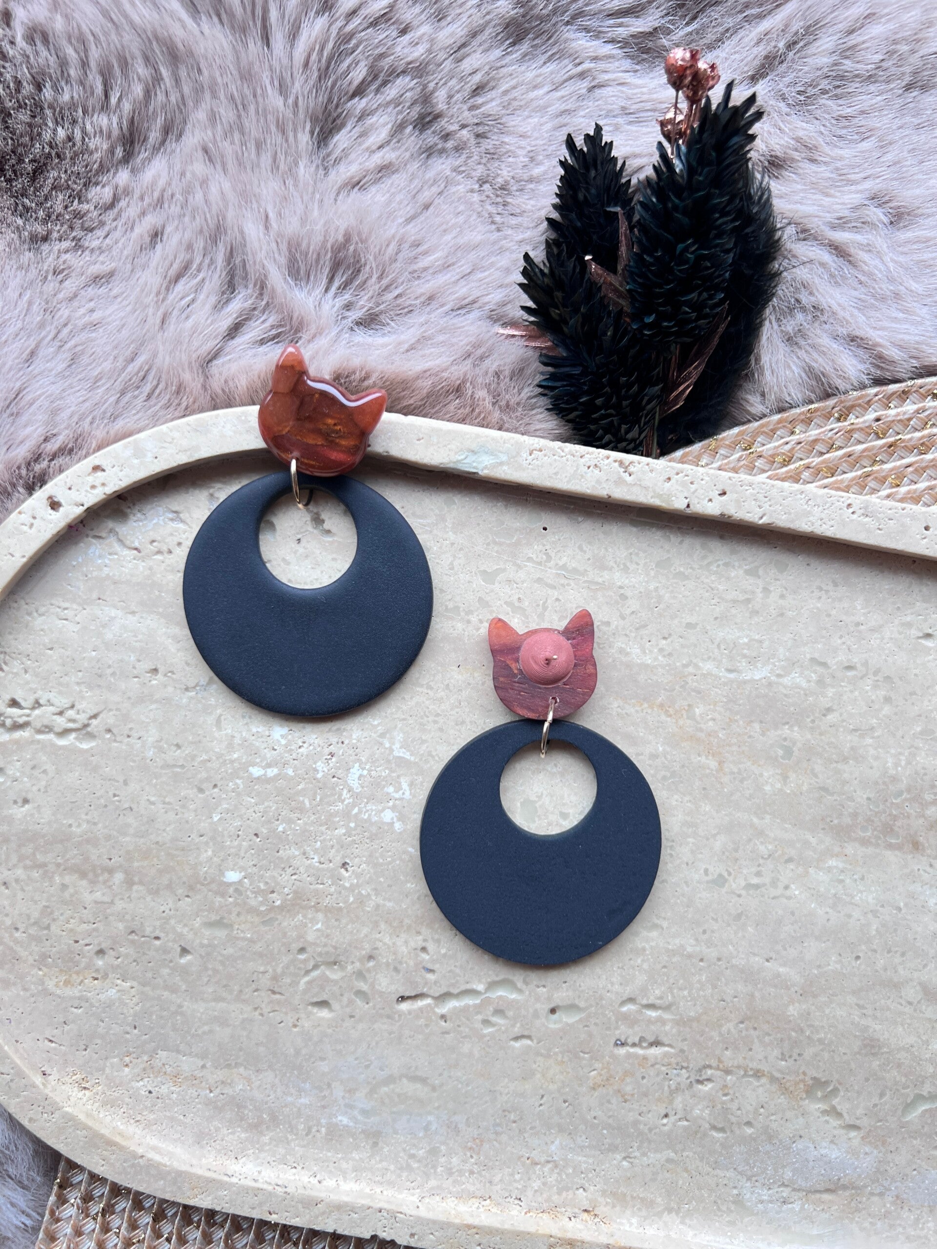 De Orange Marble oorbellen combineren een mat zwarte cirkelvorm met een kattenvormig element in warme, gemarmerde oranjetinten. Het contrast tussen mat en glans zorgt voor een krachtige maar verfijnde balans, typisch voor de Chulloo-signatuur.