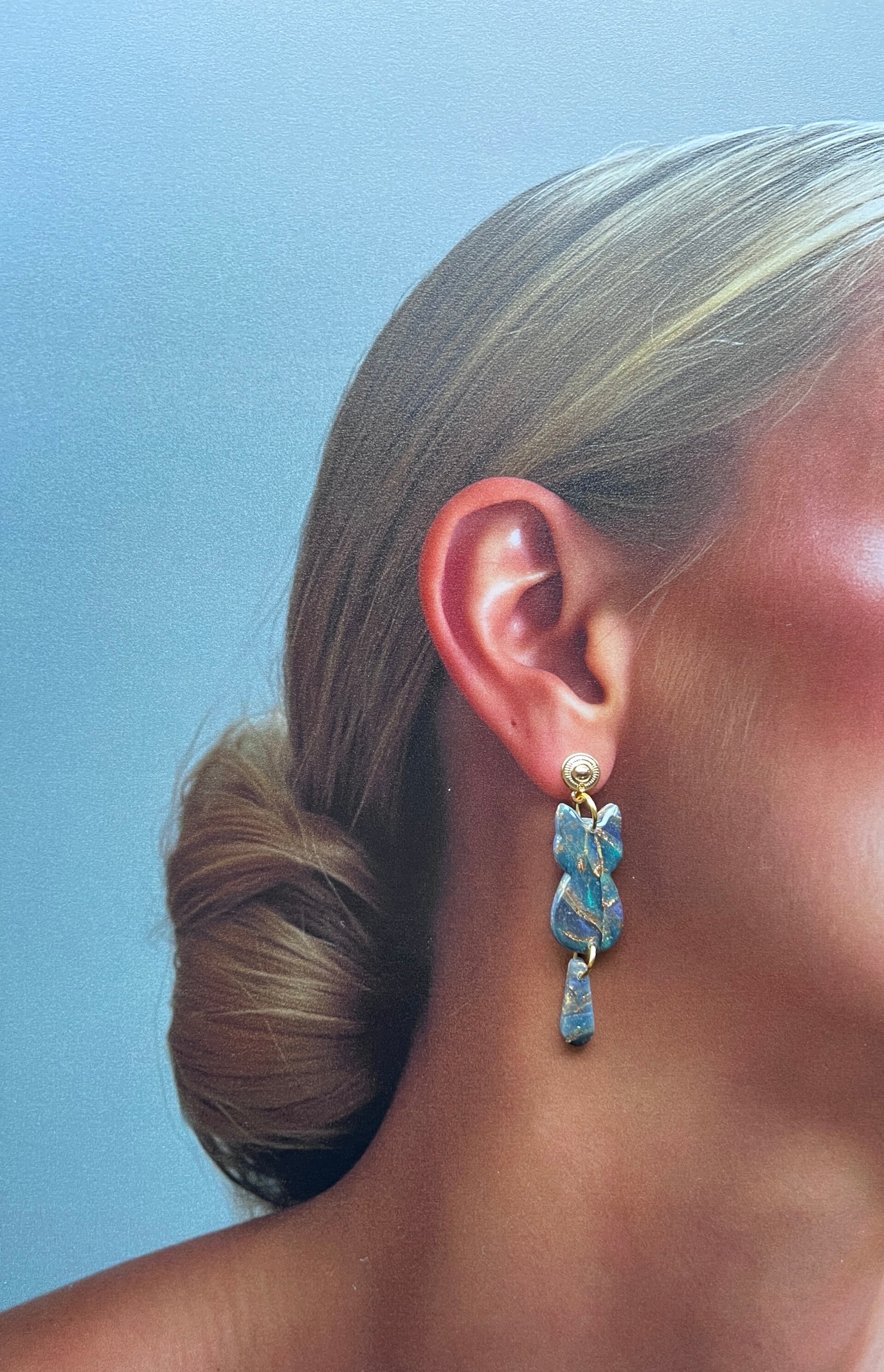 De Peacock Gold kattenoorbellen combineren diepe blauw- en groentinten met verfijnde goudkleurige accenten in een glanzende resin afwerking. De slanke vorm en het speelse staartdetail zorgen voor een elegant silhouet met een rijke, gelaagde uitstraling. Een uitgesproken statement binnen de Chulloo-collectie.