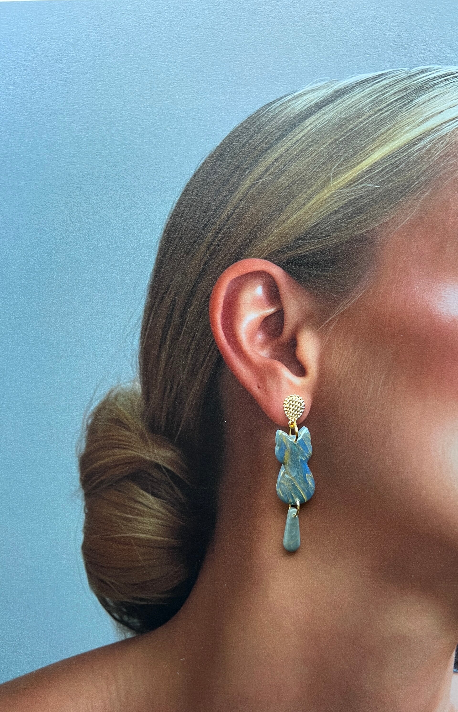 De Peacock kattenoorbellen combineren diepe blauwtinten met zachte groene schakeringen en een subtiele glans. Het gemarmerde effect geeft elke oorbel een unieke uitstraling, terwijl het slanke silhouet en het speelse staartdetail zorgen voor een verfijnde balans tussen elegant en uitgesproken.