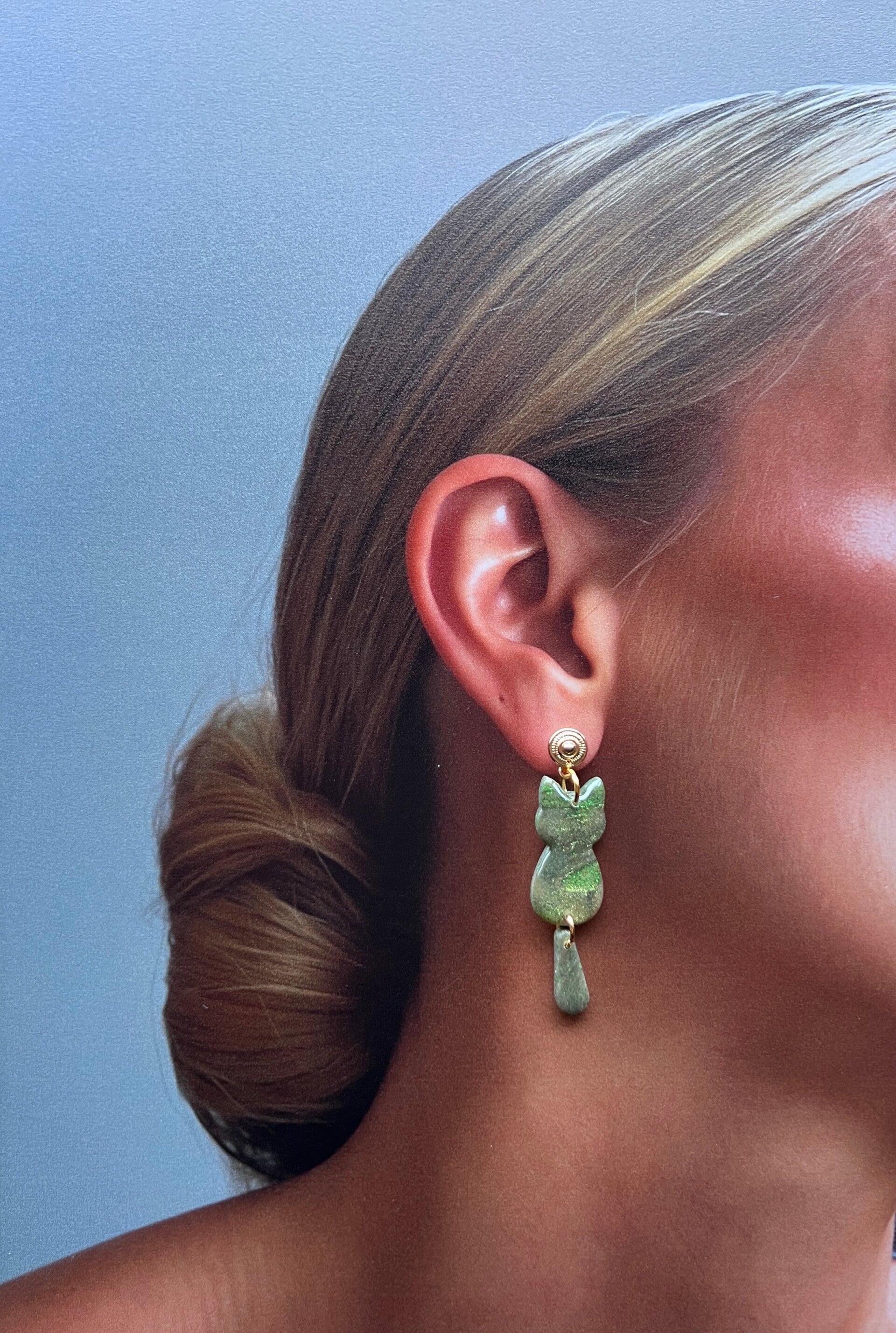 De Forest kattenoorbellen combineren diepe groentinten met een fijne, glanzende afwerking die doet denken aan mos en schaduwrijke bladeren. Het gemarmerde effect geeft elke oorbel een unieke uitstraling, terwijl het slanke silhouet en het speelse staartdetail zorgen voor een uitgebalanceerd en verfijnd geheel.