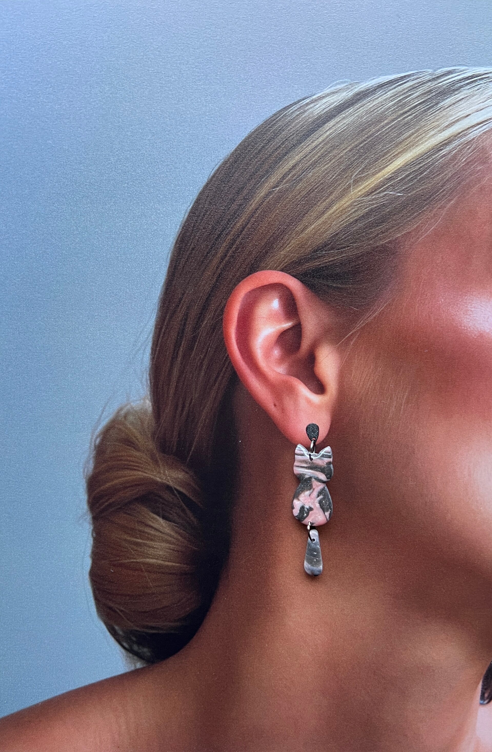 De Black Rose kattenoorbellen combineren een diepe zwarte basis met zachte roze marmerpatronen in een subtiel glanzende afwerking. Het contrast tussen donker en licht zorgt voor een rustige maar karaktervolle uitstraling. De slanke vorm en het speelse staartdetail geven de oorbellen een elegant silhouet dat moeiteloos opvalt.