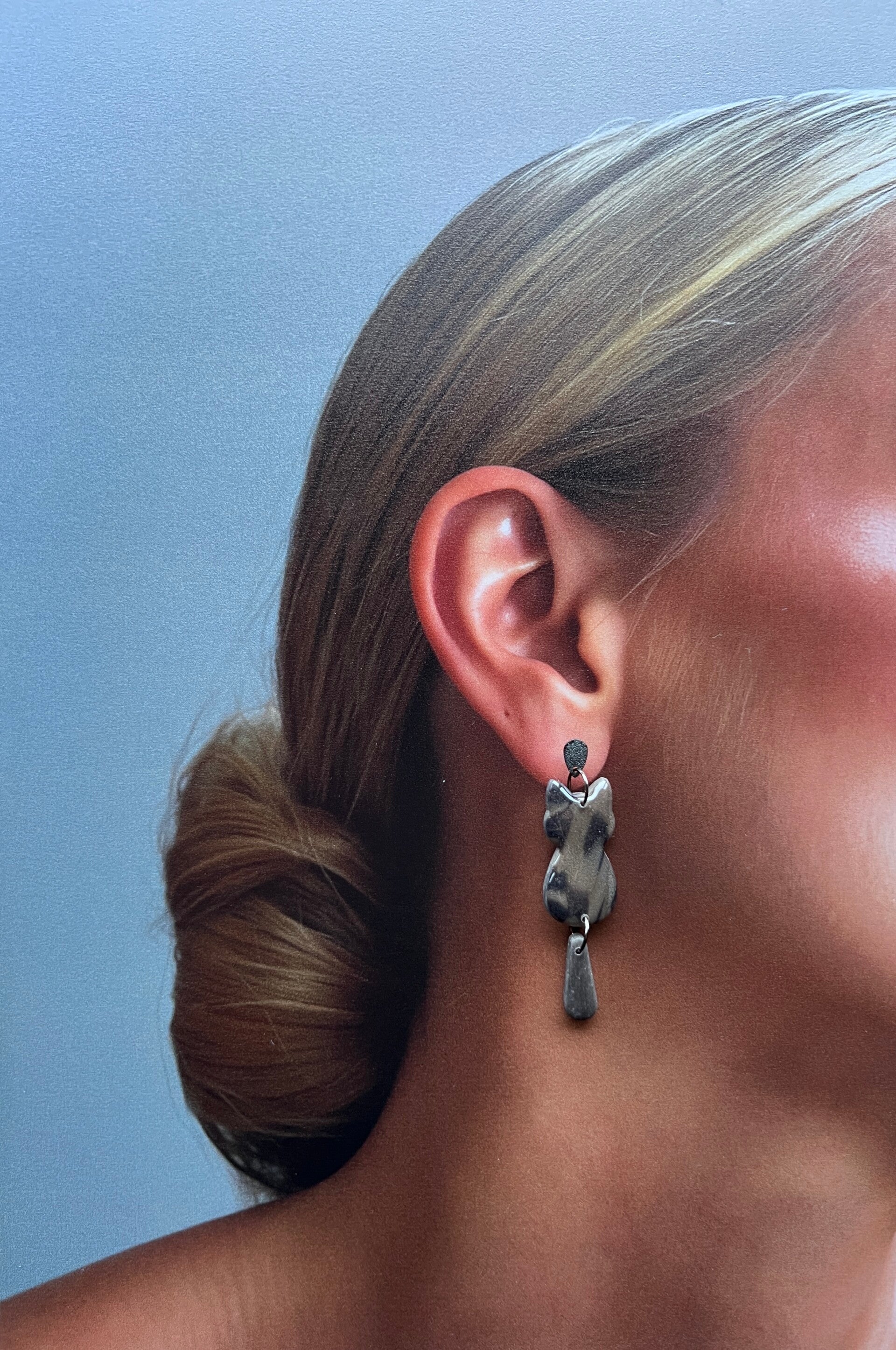 De Furry Grey kattenoorbellen combineren zachte grijs- en antraciettinten in een fijn gemarmerd patroon. De subtiele glans geeft diepte aan de kleur, terwijl het slanke silhouet en het speelse staartdetail zorgen voor een ingetogen maar karaktervolle uitstraling binnen de Chulloo-collectie.