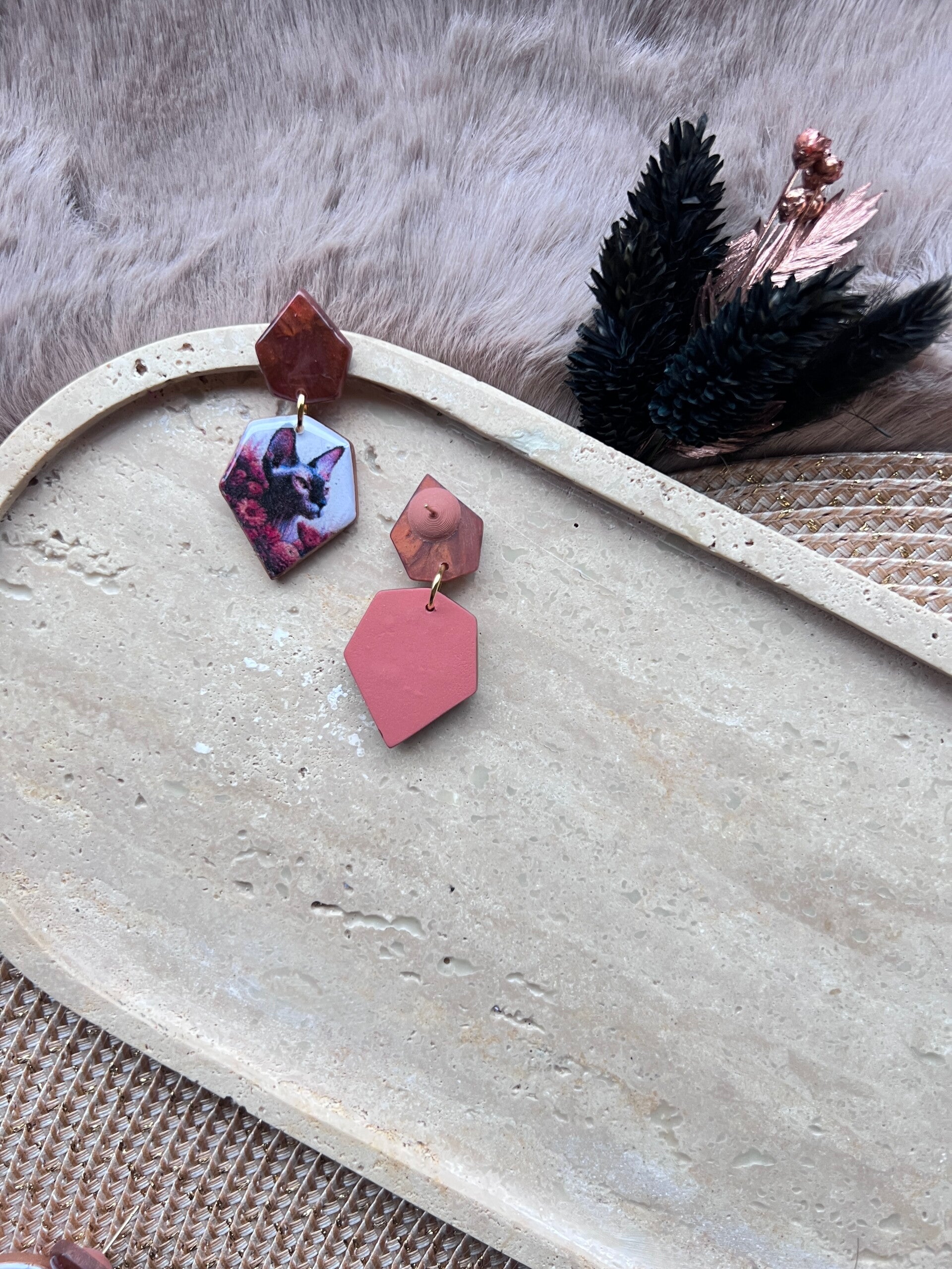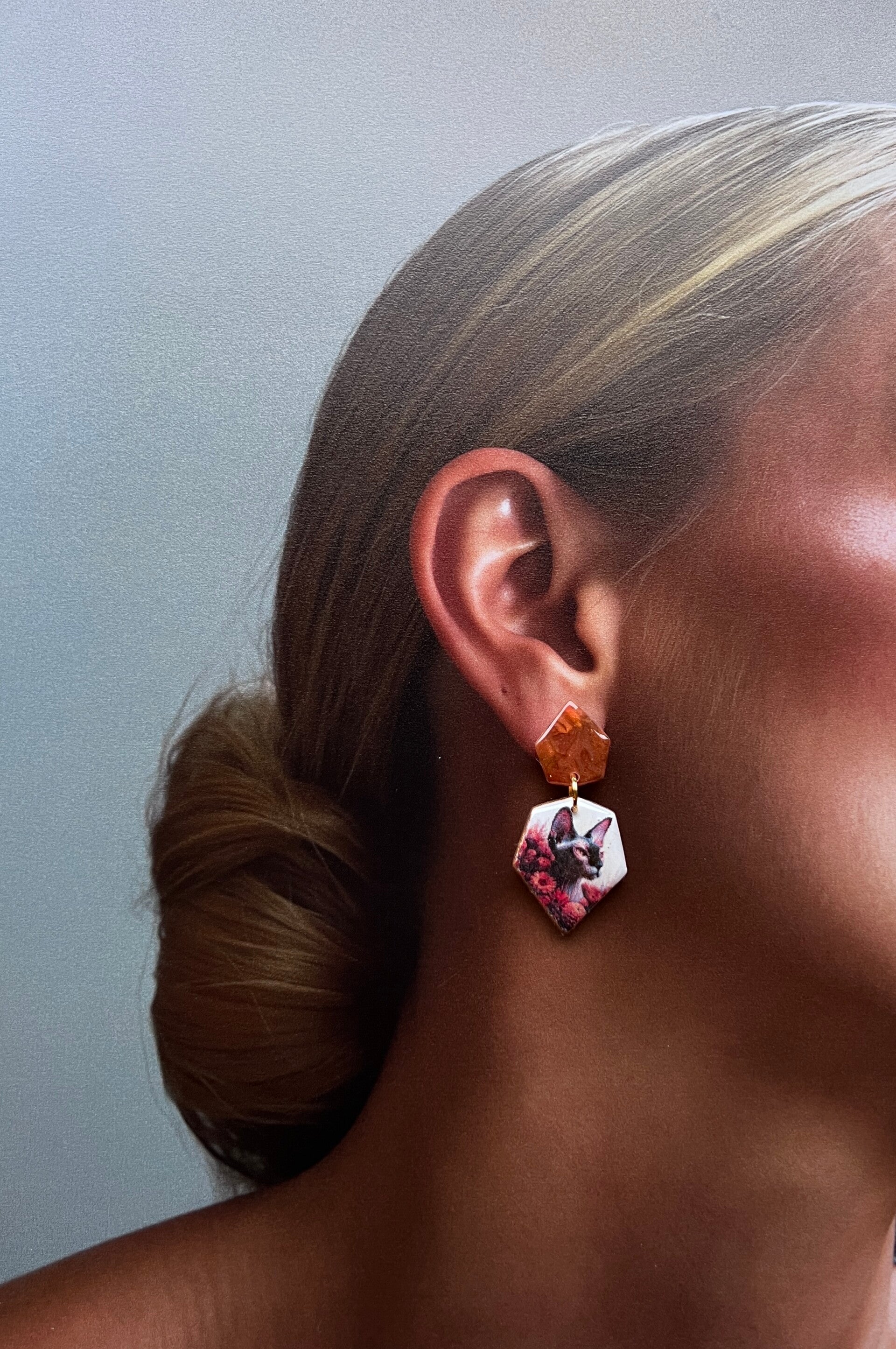 Deze sphynx kattenoorbellen zijn ontworpen als een ode aan de unieke uitstraling van de sphynx. De combinatie van strakke vormen, zachte marmerpatronen en een verfijnde illustratie benadrukt het karakter en het herkenbare silhouet van dit bijzondere ras. Een zorgvuldig vormgegeven statement, waarin eenvoud, vorm en detail centraal staan.