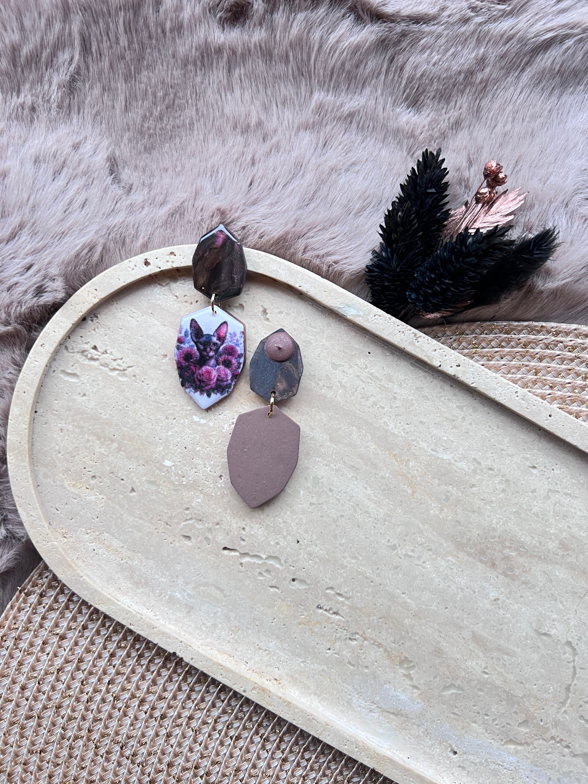 Deze sphynx kattenoorbellen zijn ontworpen als een ode aan de unieke uitstraling van de sphynx. De combinatie van strakke vormen, zachte marmerpatronen en een verfijnde illustratie benadrukt het karakter en het herkenbare silhouet van dit bijzondere ras. Een zorgvuldig vormgegeven statement, waarin eenvoud, vorm en detail centraal staan.