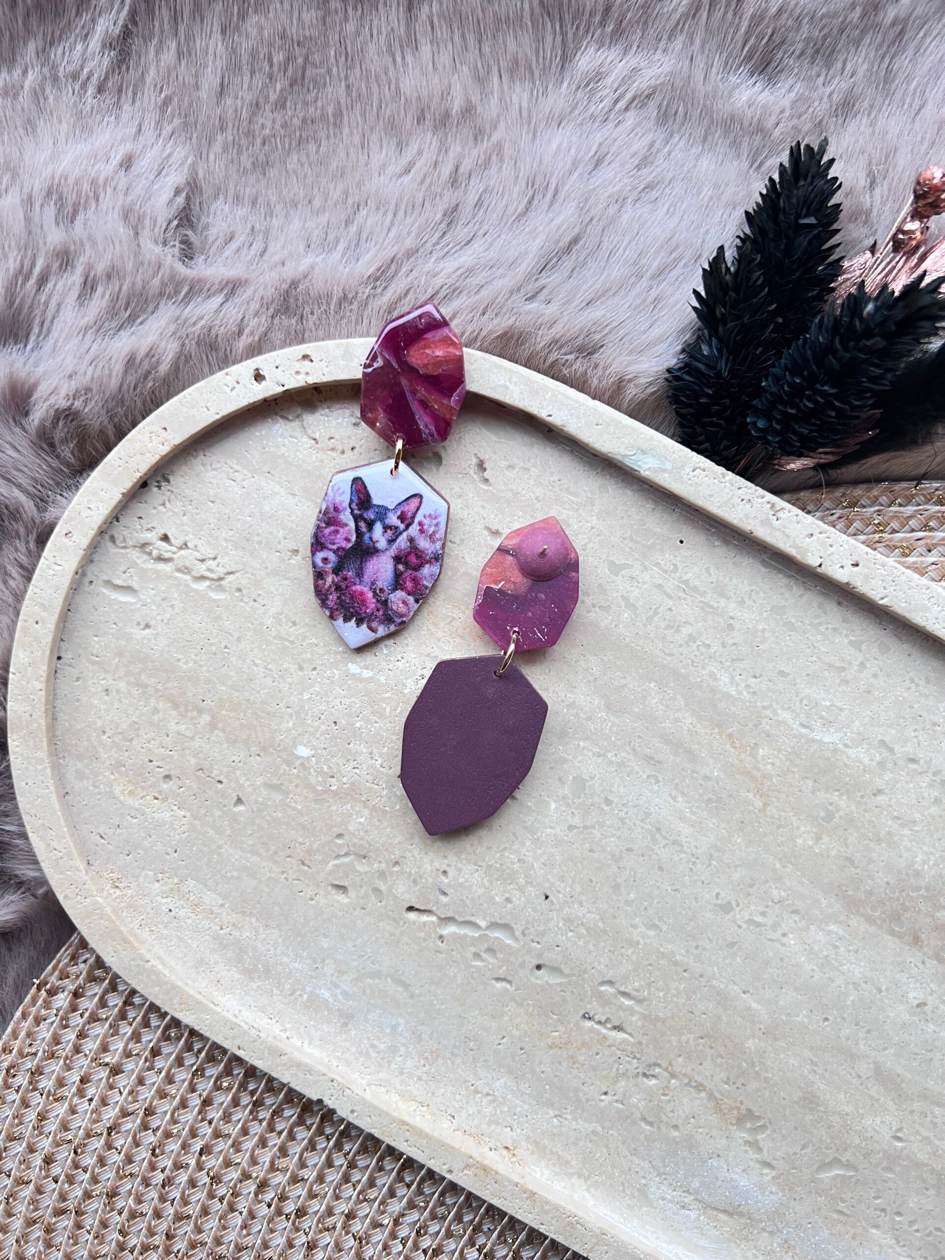 Deze sphynx kattenoorbellen zijn ontworpen als een ode aan de unieke uitstraling van de sphynx. De combinatie van strakke vormen, zachte marmerpatronen en een verfijnde illustratie benadrukt het karakter en het herkenbare silhouet van dit bijzondere ras. Een zorgvuldig vormgegeven statement, waarin eenvoud, vorm en detail centraal staan.