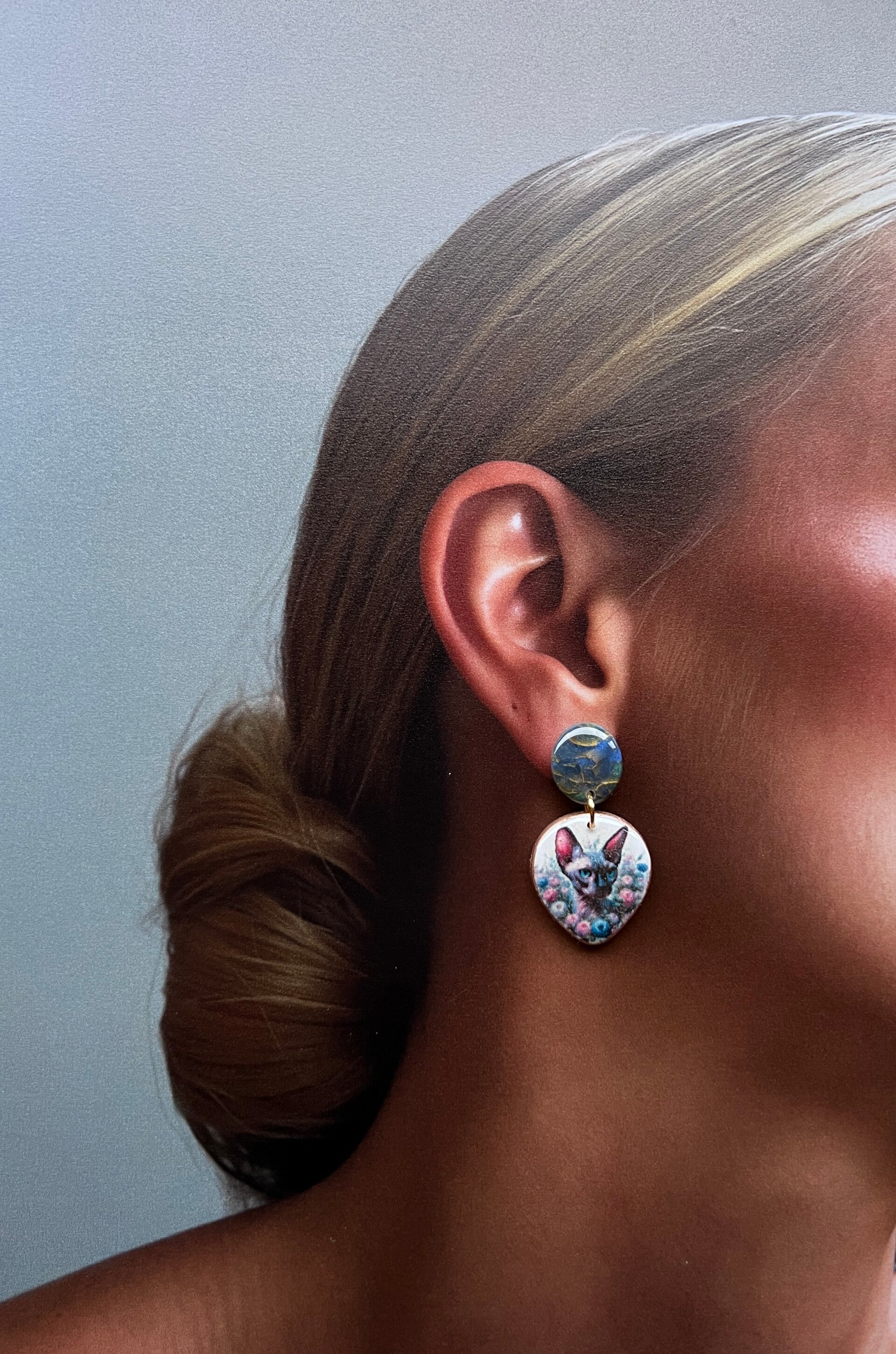 Deze sphynx kattenoorbellen zijn ontworpen als een ode aan de unieke uitstraling van de sphynx. De combinatie van strakke vormen, zachte marmerpatronen en een verfijnde illustratie benadrukt het karakter en het herkenbare silhouet van dit bijzondere ras. Een zorgvuldig vormgegeven statement, waarin eenvoud, vorm en detail centraal staan.