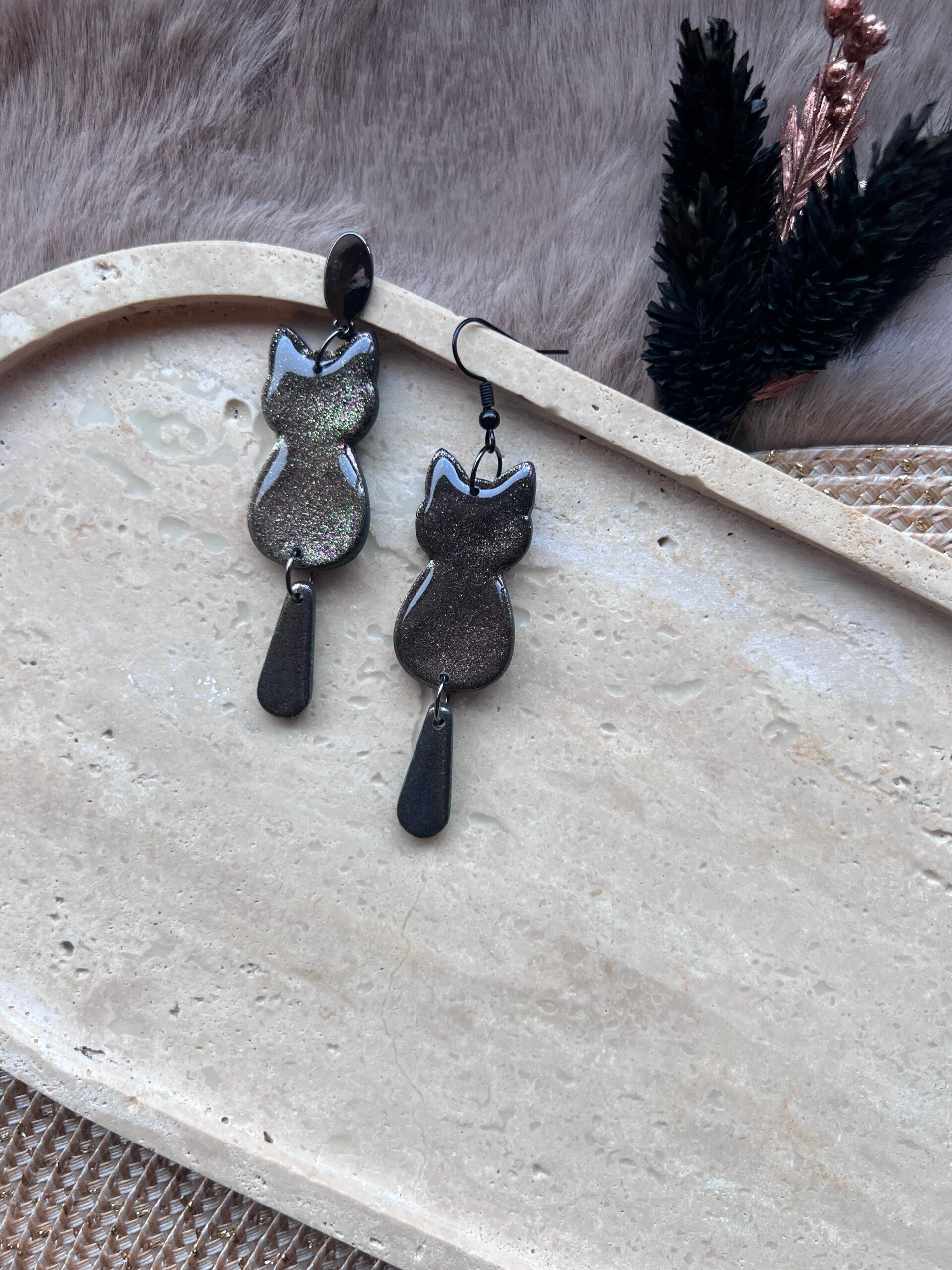 Een iconisch katten silhouet in diep antraciet met een subtiele glitterlaag.
