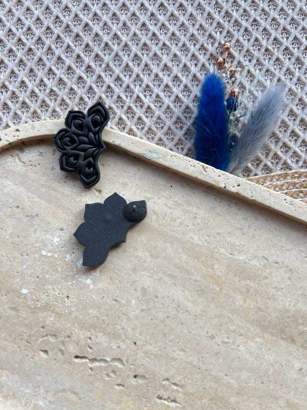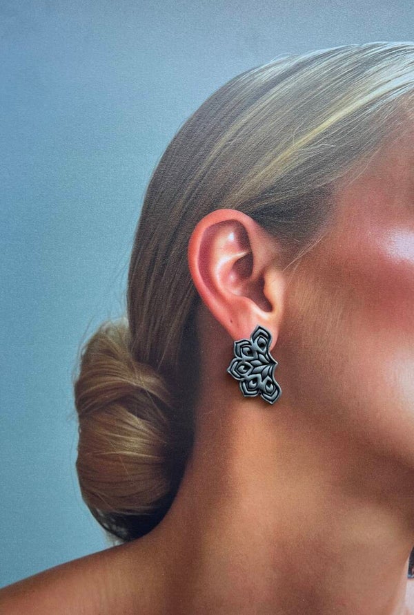 Zwarte statement studs met een verfijnd, uitgesneden patroon. Minimalistisch in kleur, maar met een krachtige uitstraling die meteen opvalt.