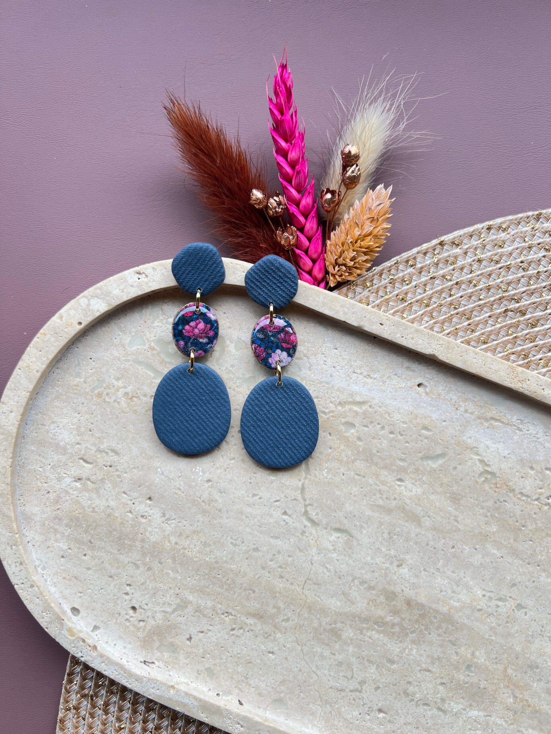 Het diepe denimblauw geeft deze oorbellen hun sterke uitstraling, terwijl de bloemenprint zorgt voor dat extra detail dat het geheel afmaakt. Het voelt anders dan anders, en net daardoor zo goed.