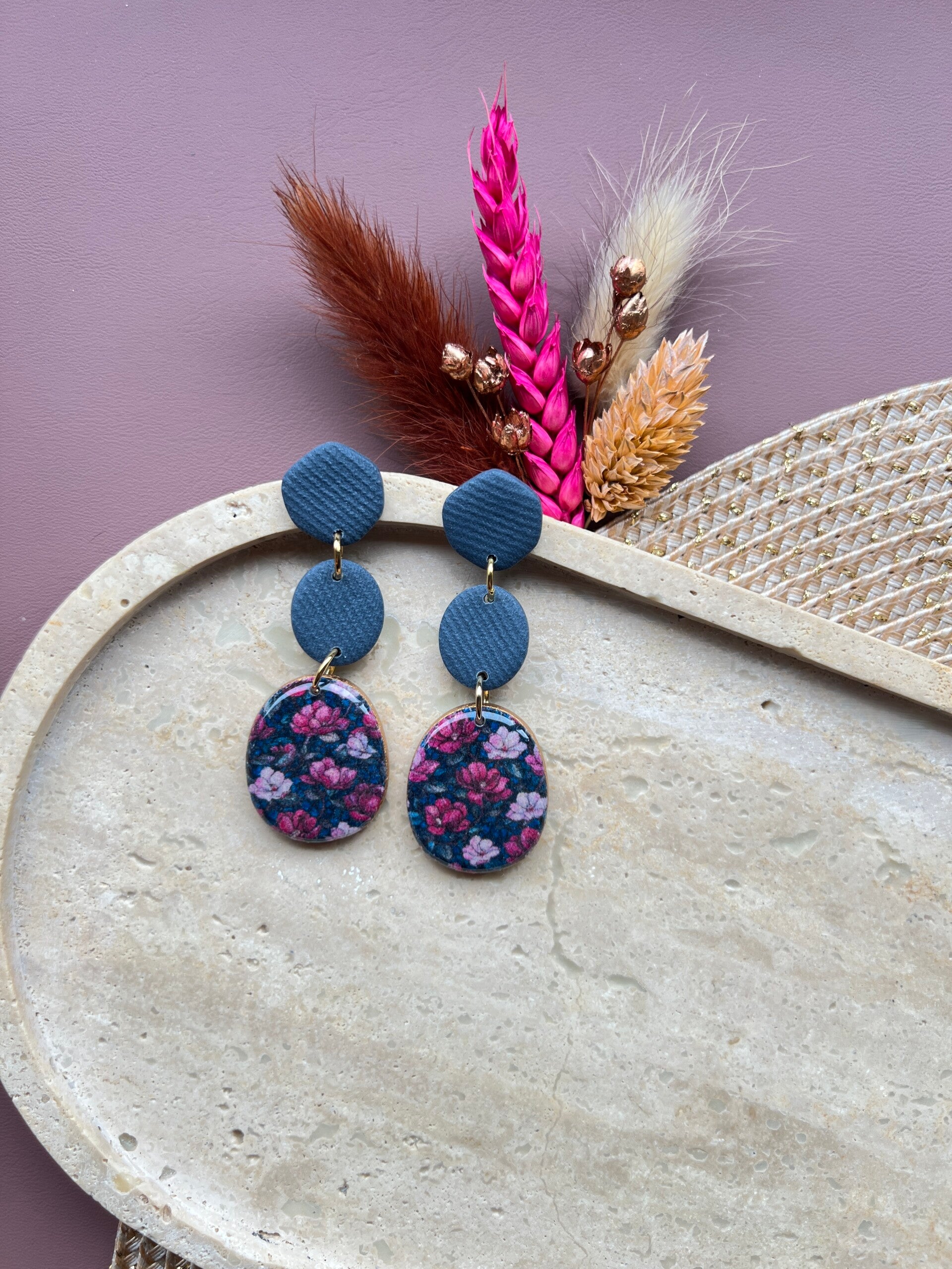 Het diepe denimblauw geeft deze oorbellen hun sterke uitstraling, terwijl de bloemenprint zorgt voor dat extra detail dat het geheel afmaakt. Het voelt anders dan anders, en net daardoor zo goed.